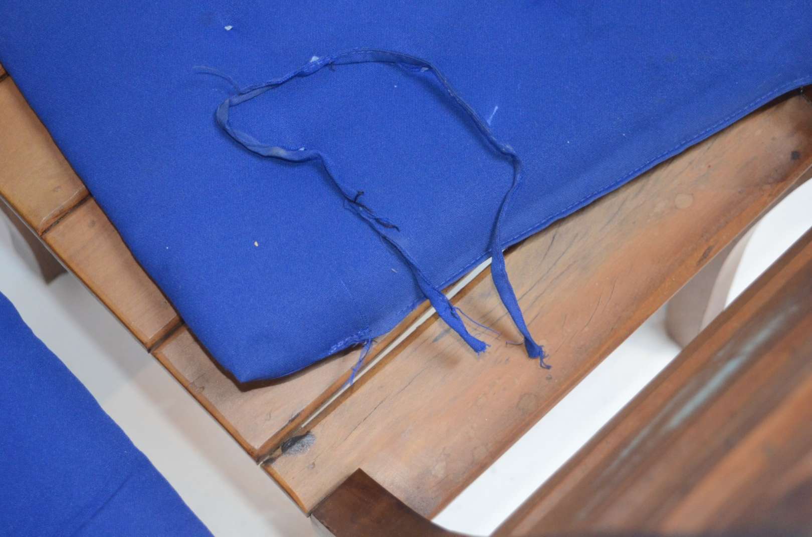 Poltrona com banqueta de ferro pintado, almofadas soltas. Oxidações.