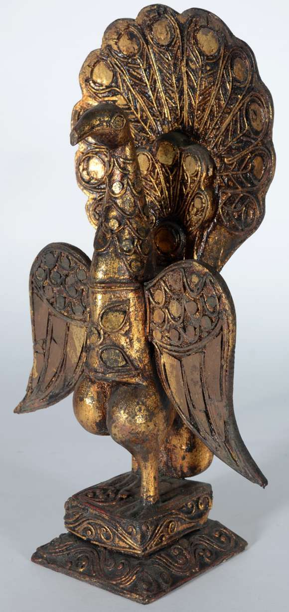 Par de figuras de black-a-moor sustentando bandejas de madeira entalhada e policromada com realces dourados. Pequeno ...