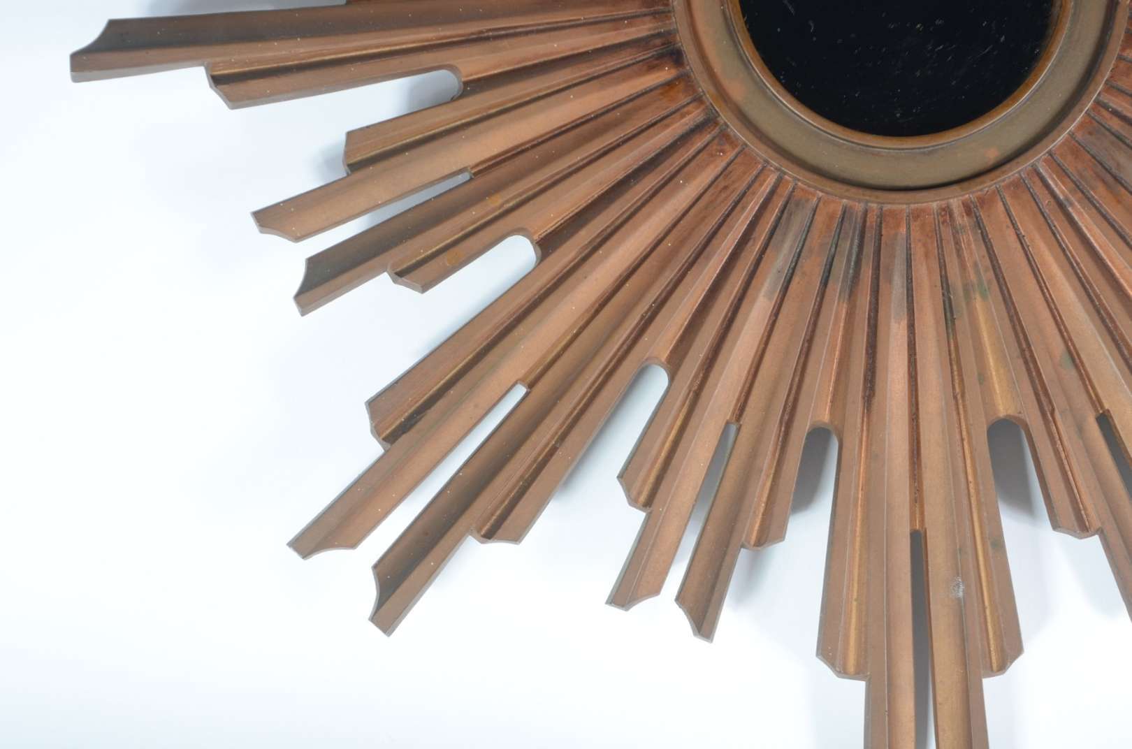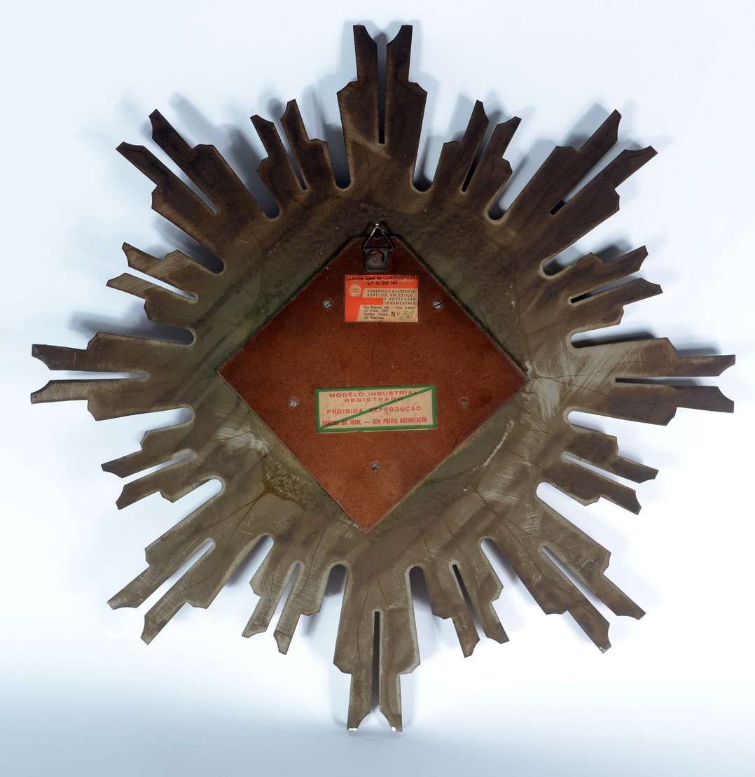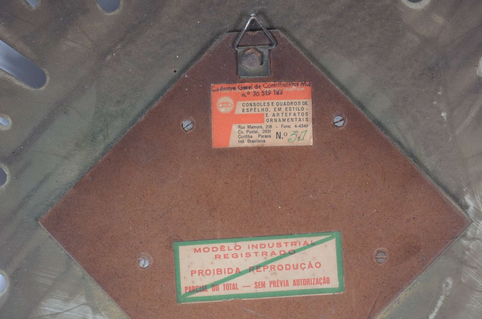 Espelho com moldura de madeira recortada e patinada de dourado. Desgastes.