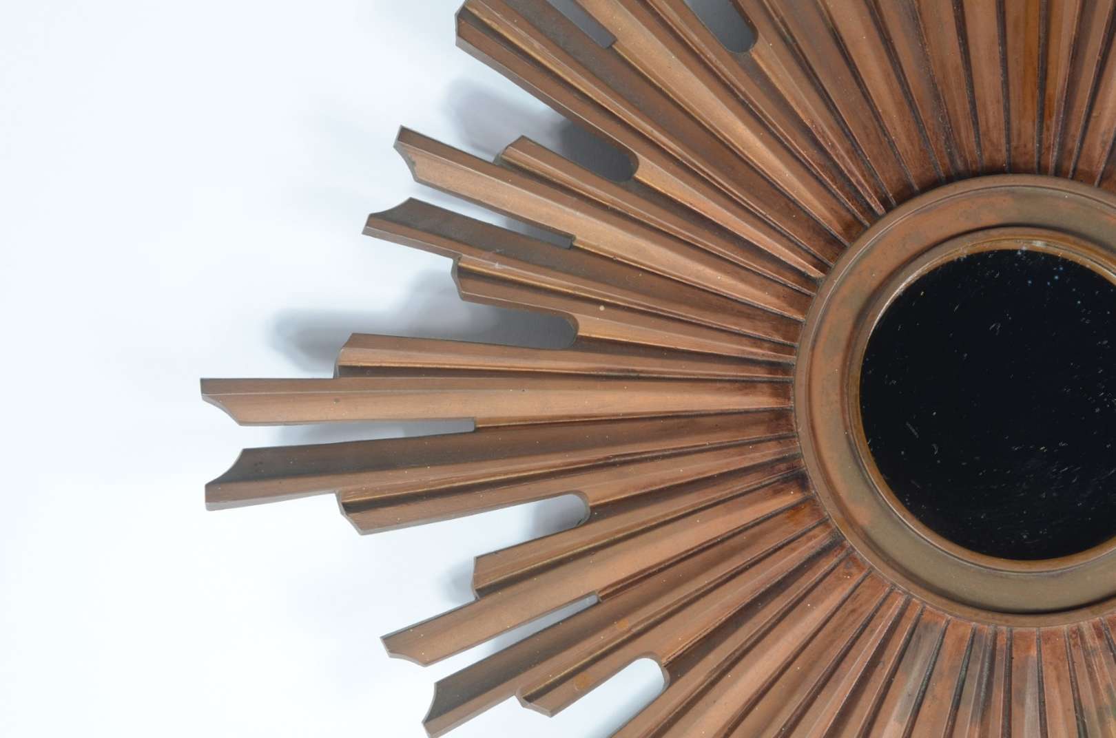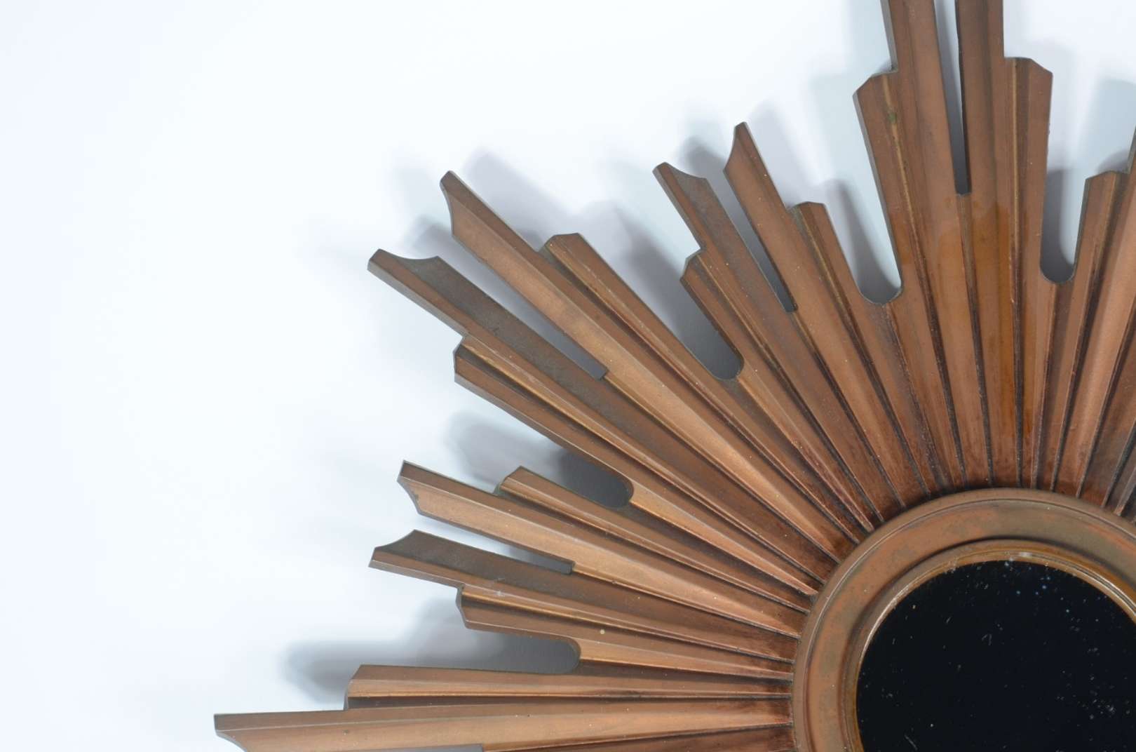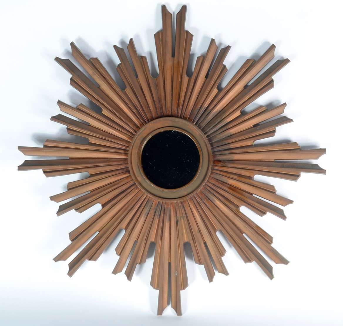 Espelho com moldura de madeira recortada e patinada de dourado. Desgastes.