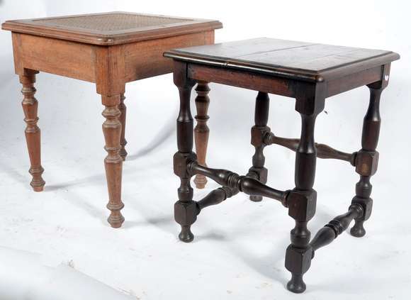 Duas banquetas/mochos de madeira nobre, sendo o mais claro com forração de palhinha, pernas torneadas. Desgastes do t...