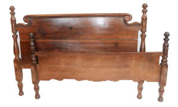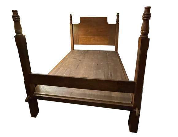Antiga cama de casal de madeira nobre, possivelmente francesa, cabeceira com pinos torneados, de encaixe. Um dos pés ...