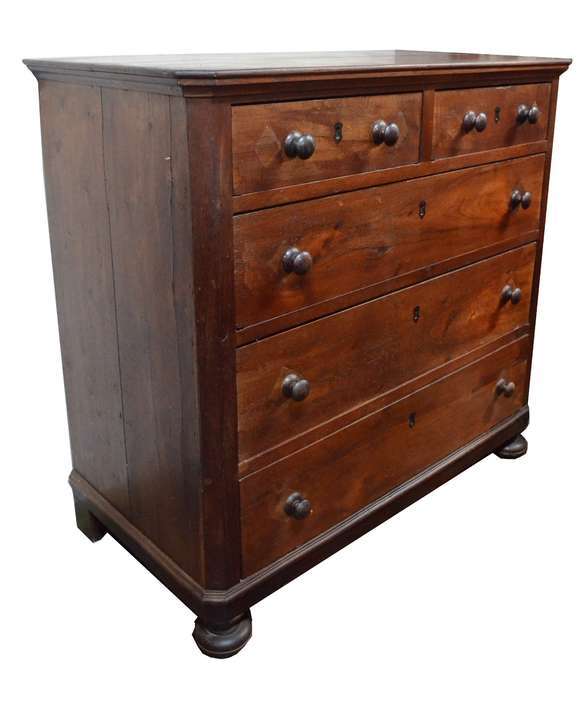 Comoda de madeira nobre, três gavetões e duas gavetas, pés de bolacha. Ja teve infestação de cupim.