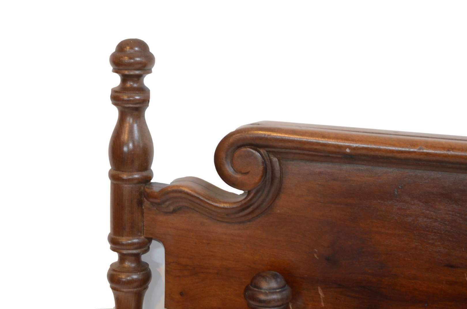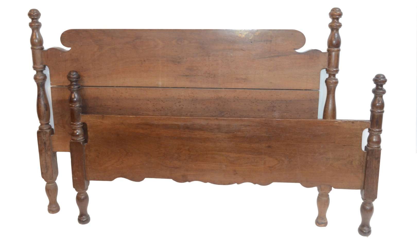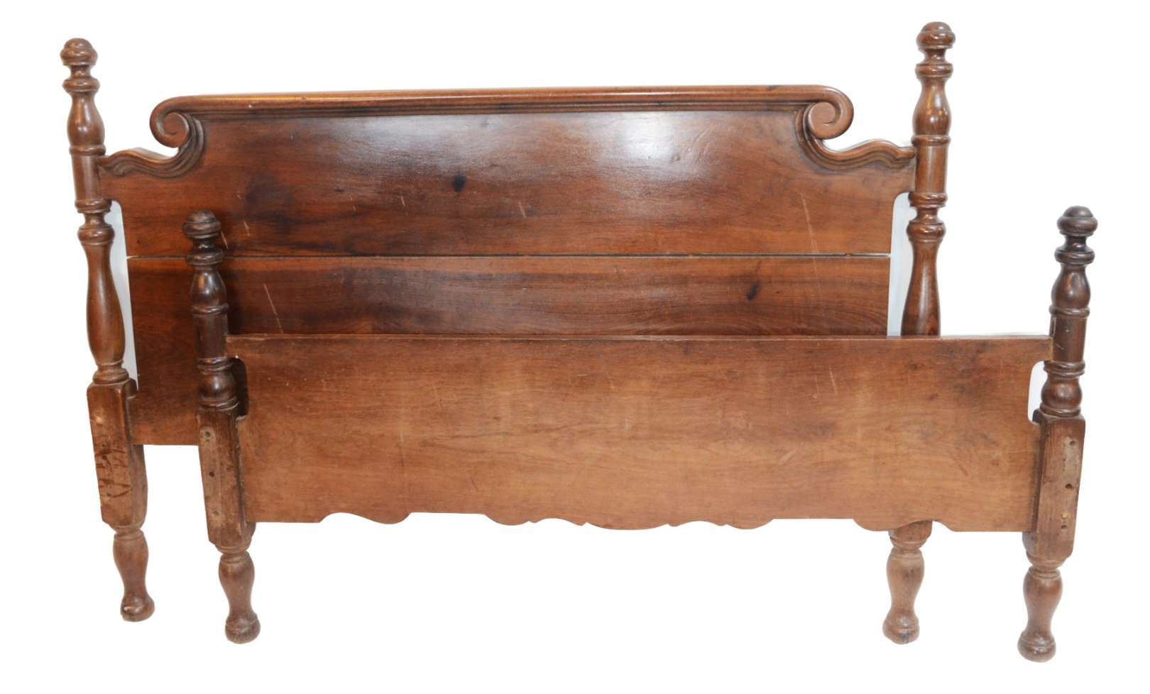 Cama de casal de madeira nobre, quinas com colunas torneadas. Completa com laterais e estrado. Pequenos desgastes do uso.
