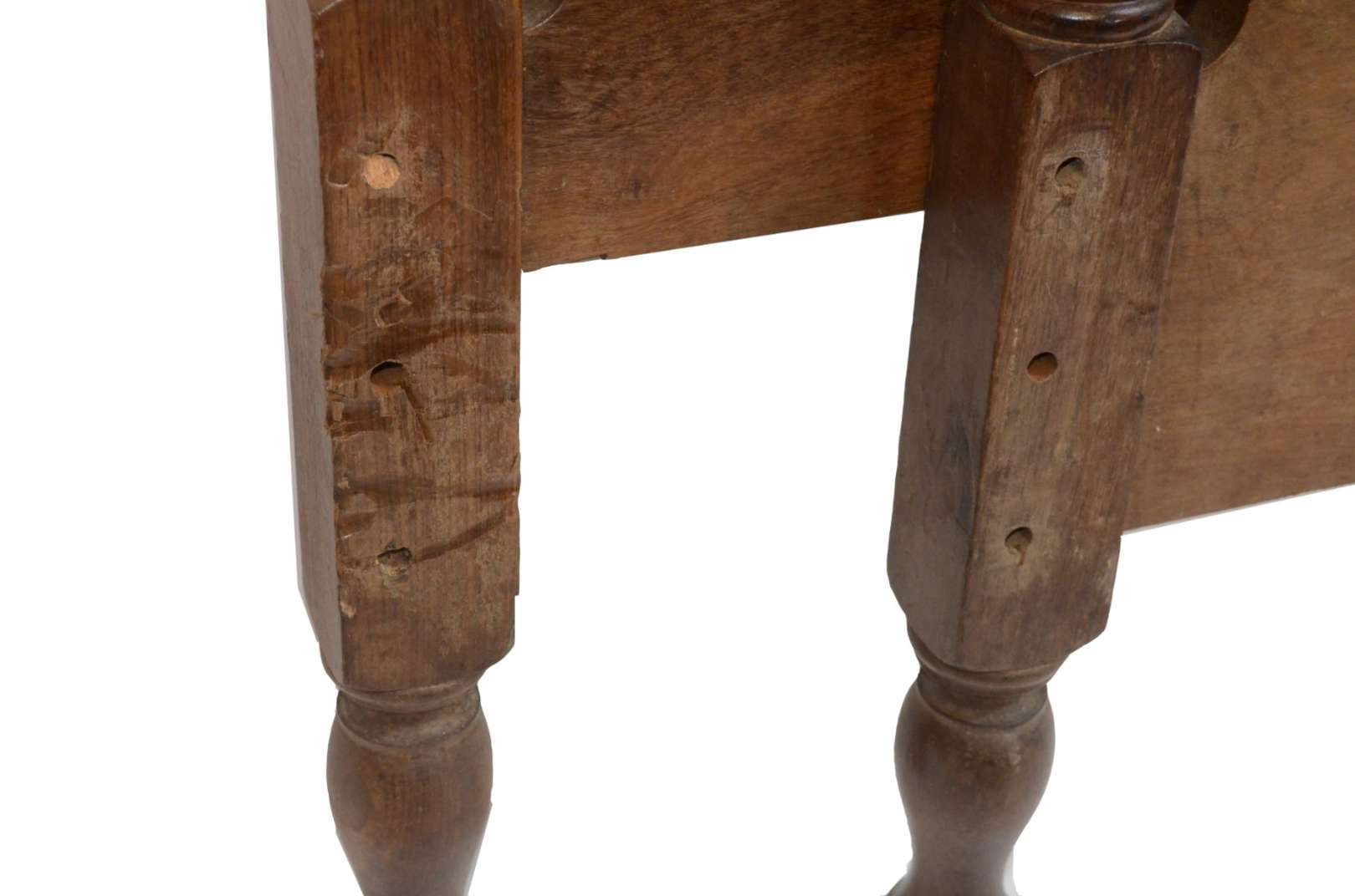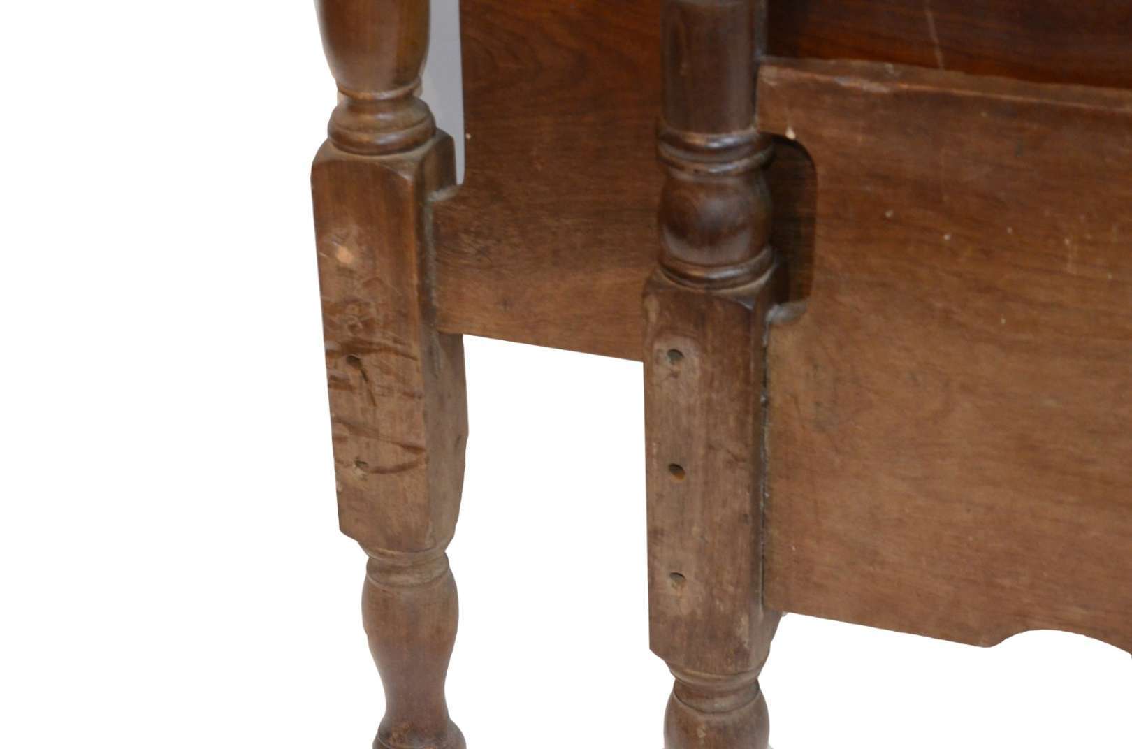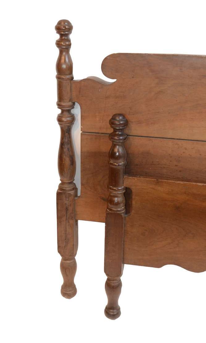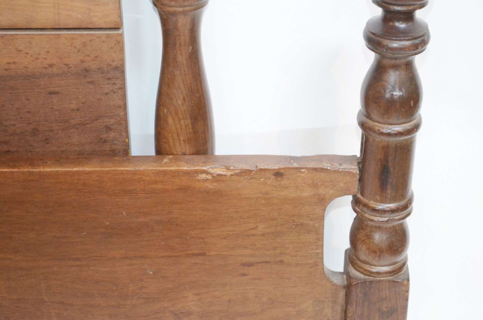 Cama de casal de madeira nobre, quinas com colunas torneadas. Completa com laterais e estrado. Pequenos desgastes do uso.