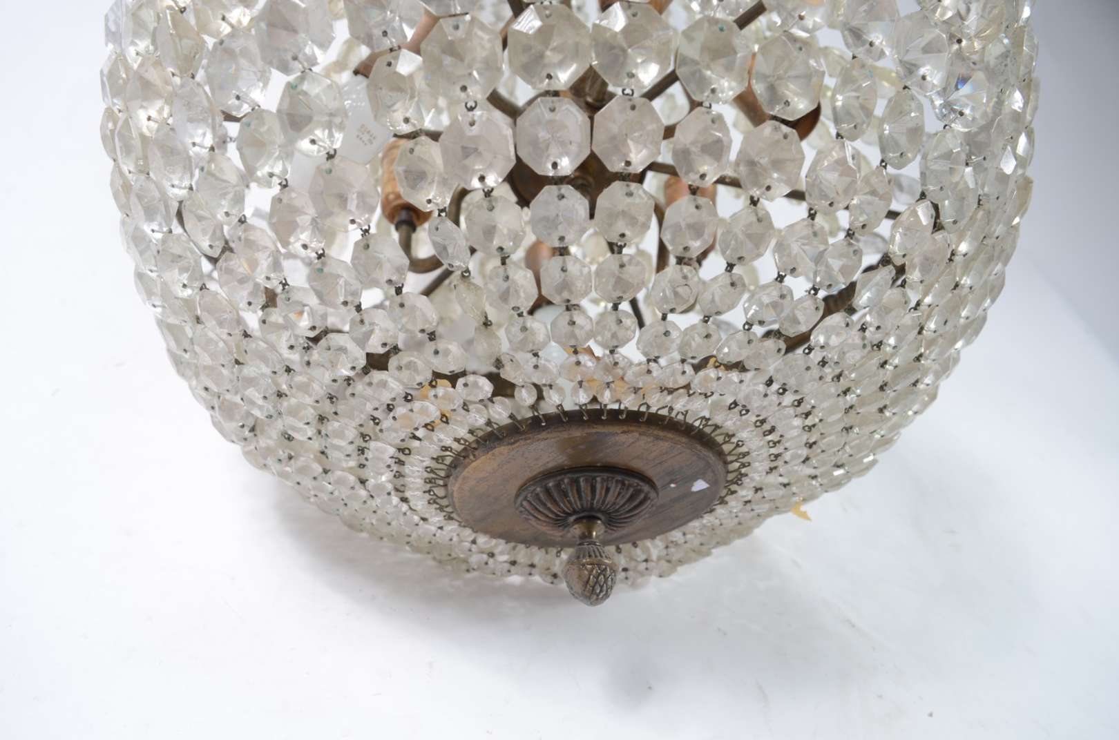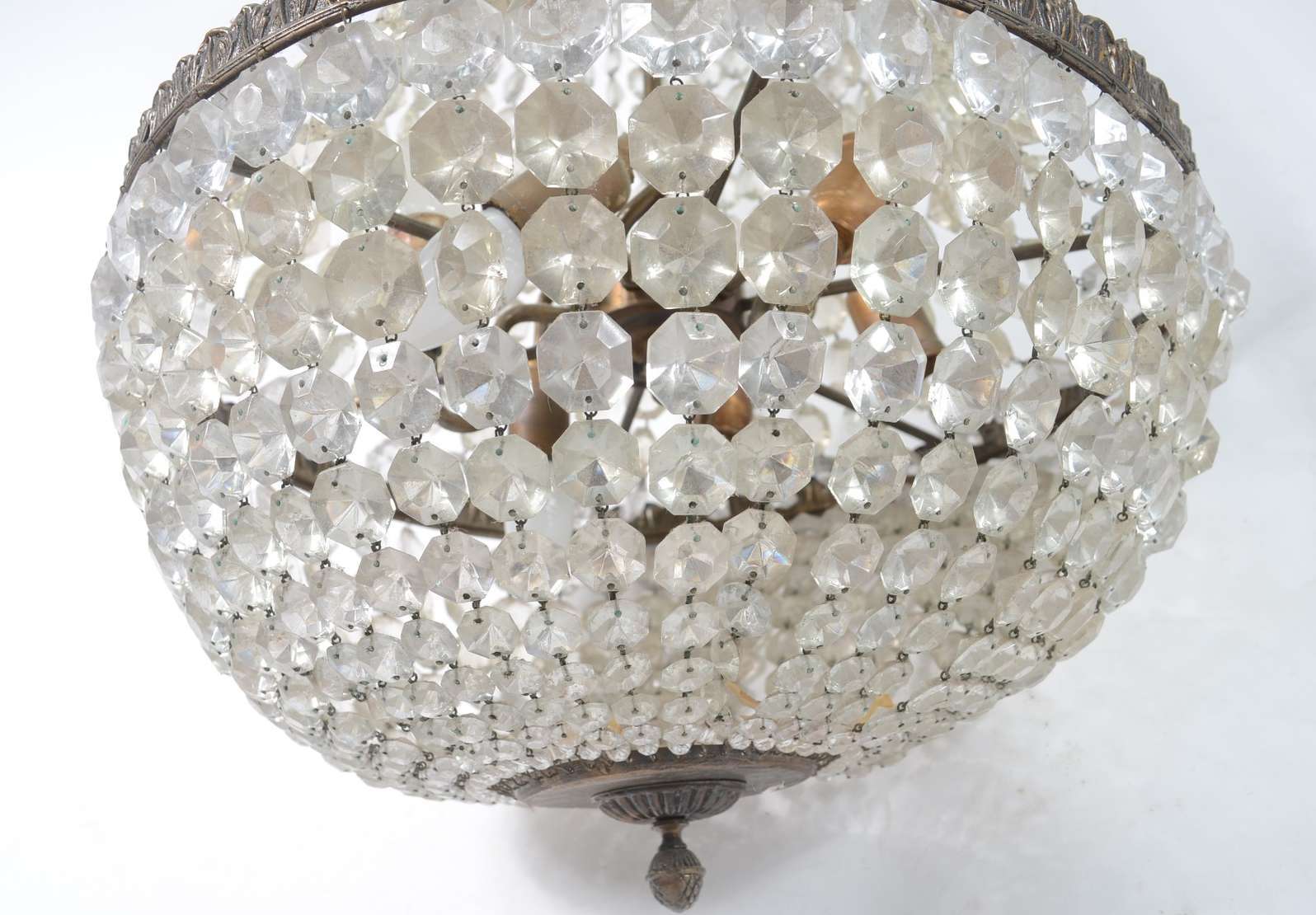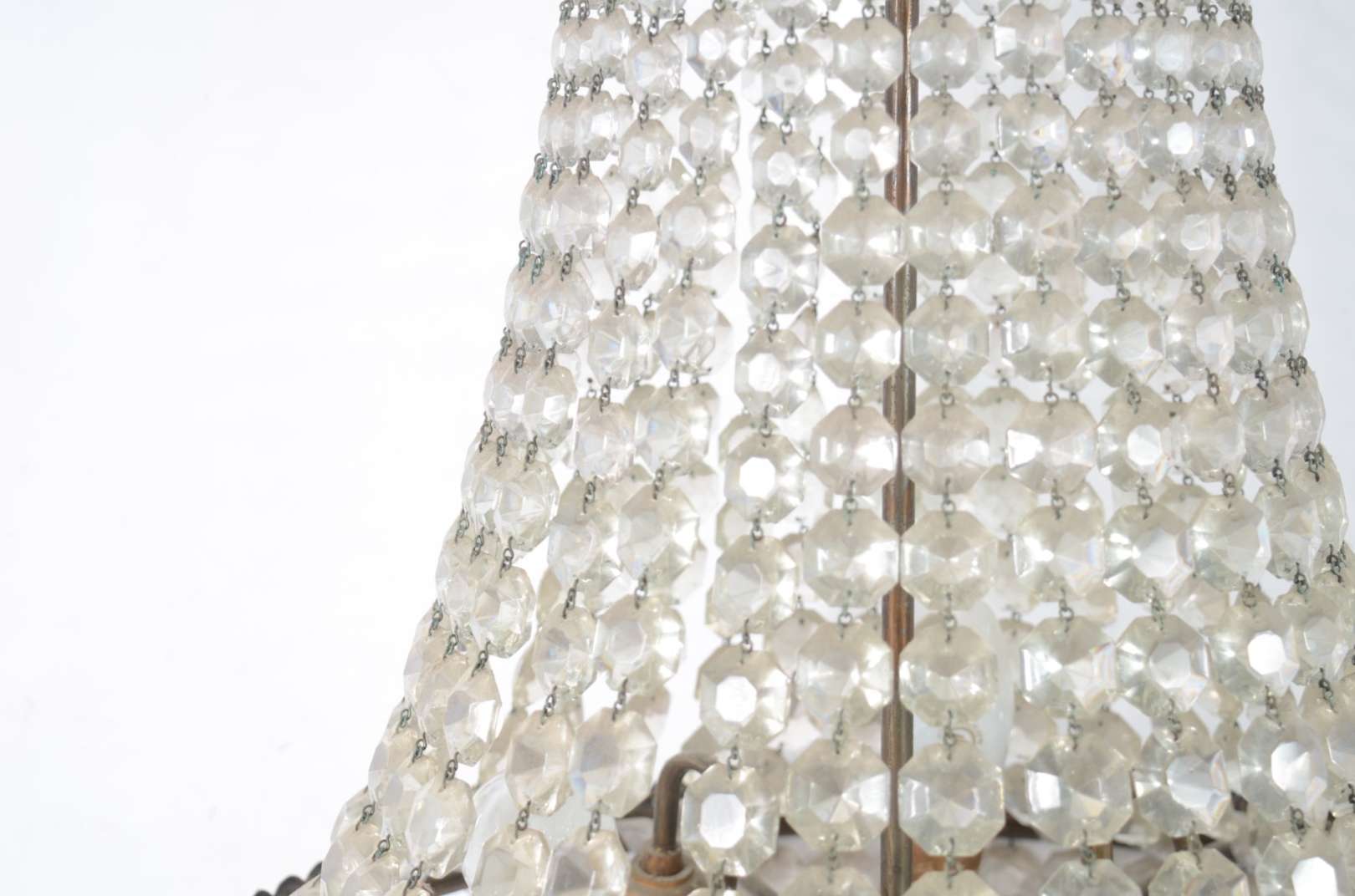 Lustre para 6 luzes de opalina verde com frisos dourados e pequenas cúpulas de pergaminho (faltando o arremate inferi...