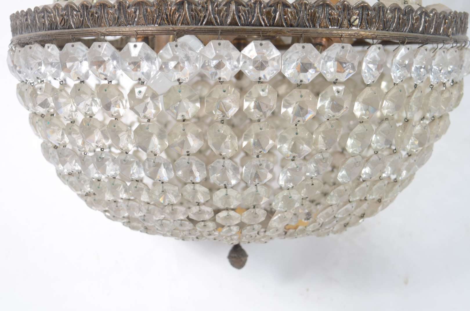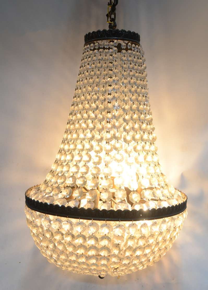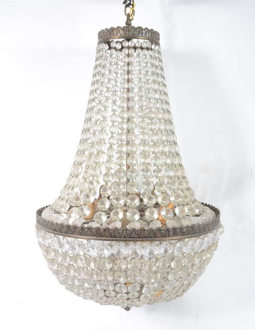 Lustre para 6 luzes de opalina verde com frisos dourados e pequenas cúpulas de pergaminho (faltando o arremate inferi...