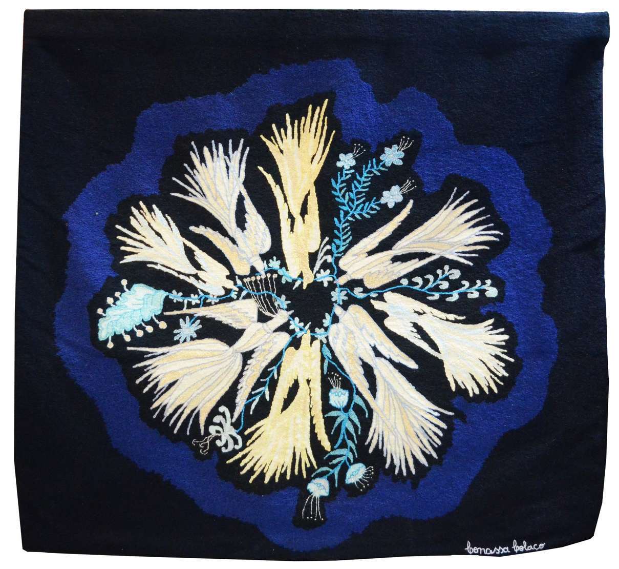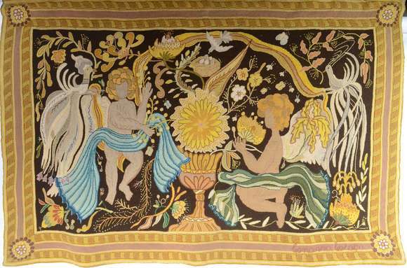 Duas tapeçarias, sendo uma assinada A.G; e, outra assinada Joana de Azevedo Moura.