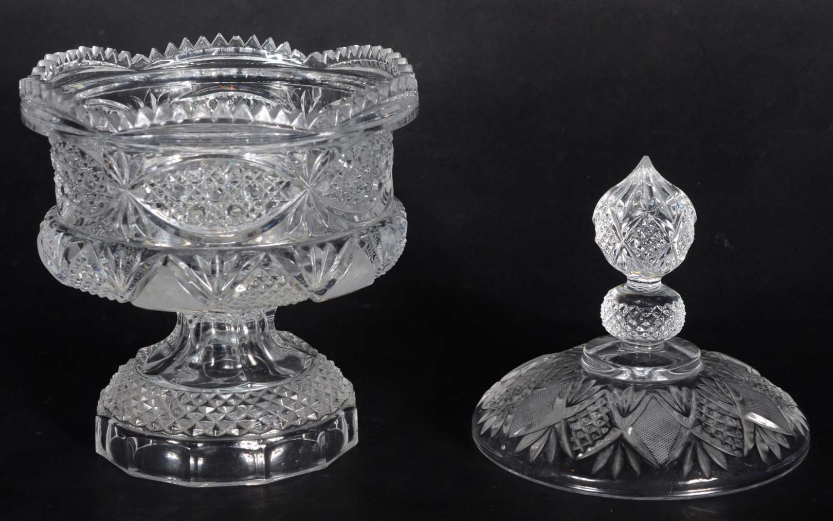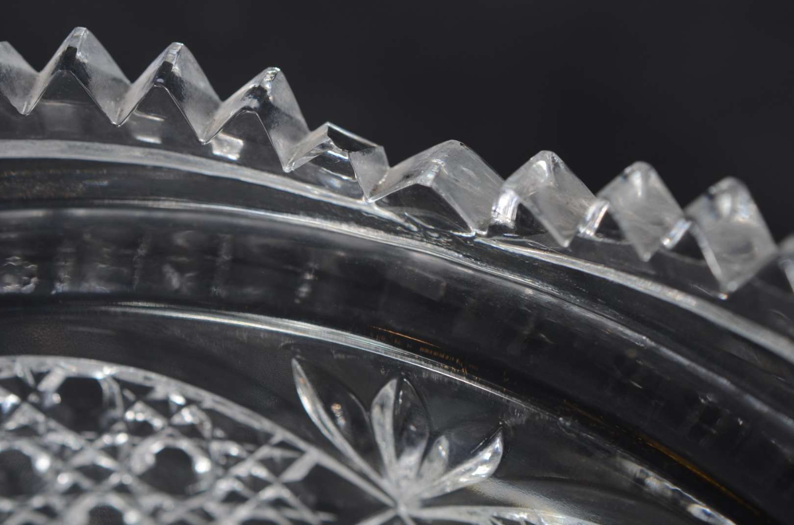 Licoreira com 6 copinhos de cristal facetado. Mínimos bicados.