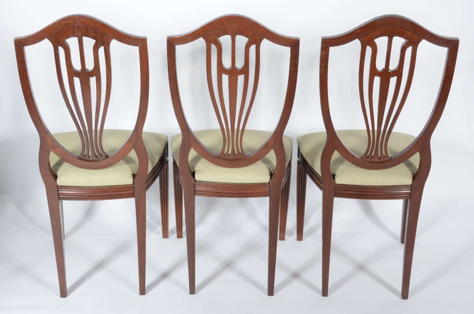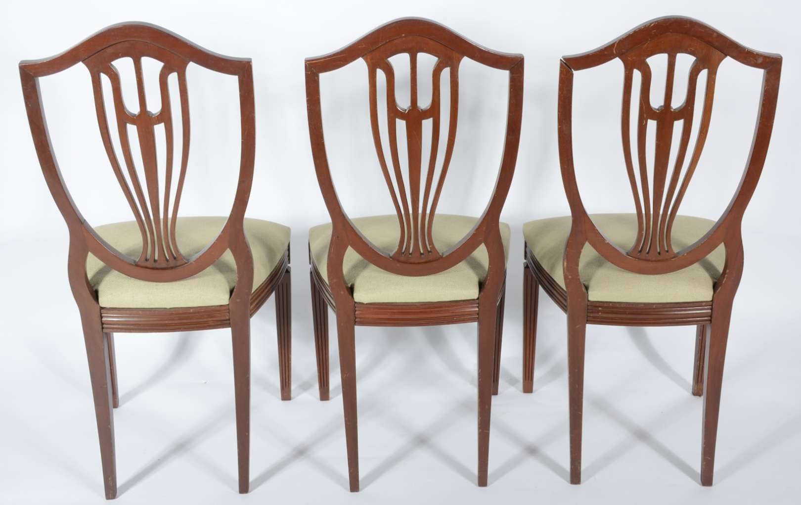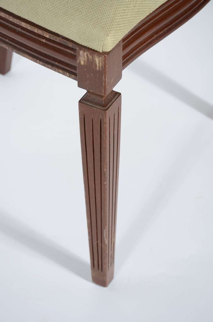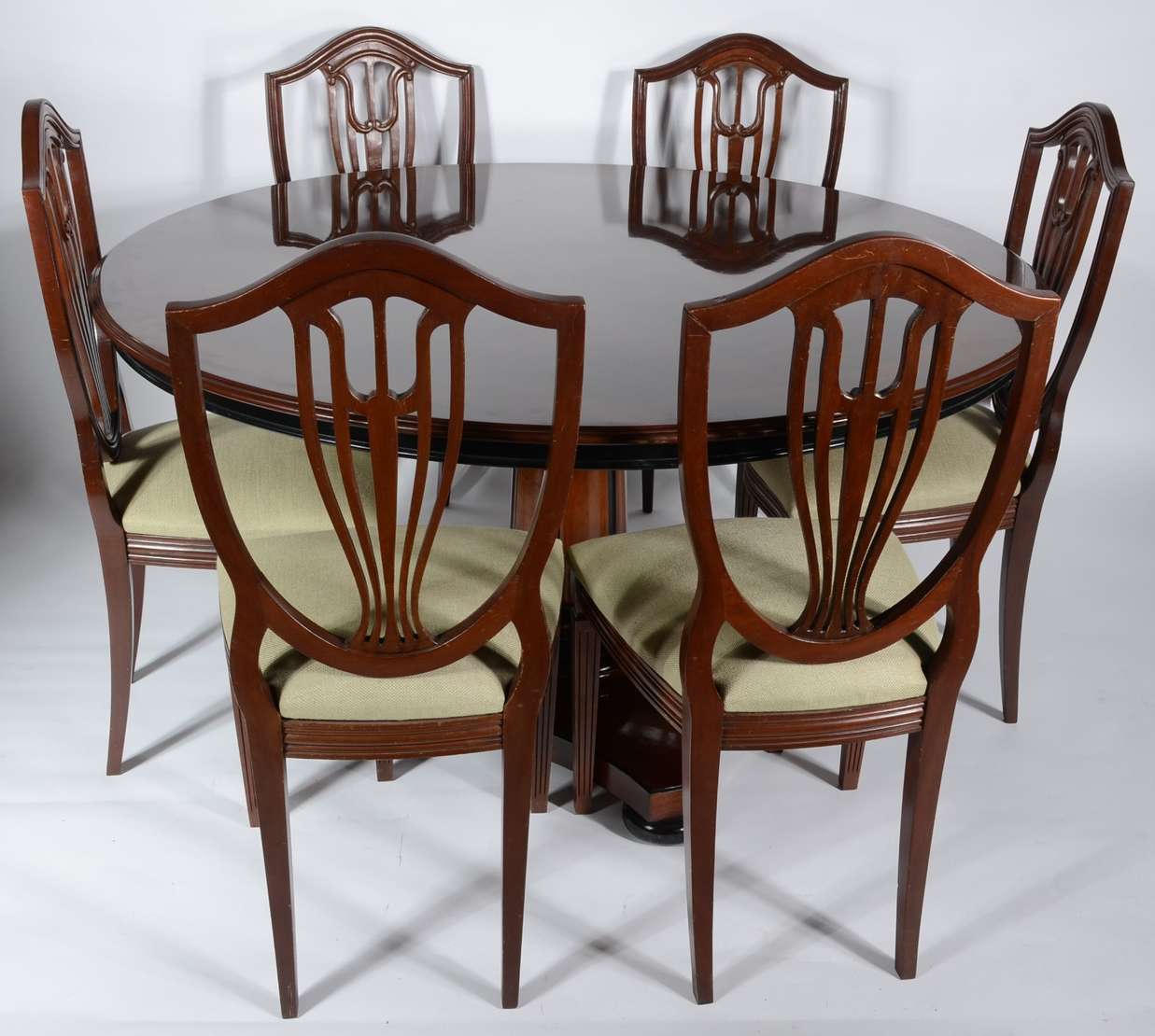 Mesa redonda de jantar de madeira nobre, apoio em coluna central frisada, base quadrangular . Acompanham 6 cadeiras com assentos estofados, estilo inglês. Desgastes na madeira, uma delas esta "bamba", precisando de reparos.