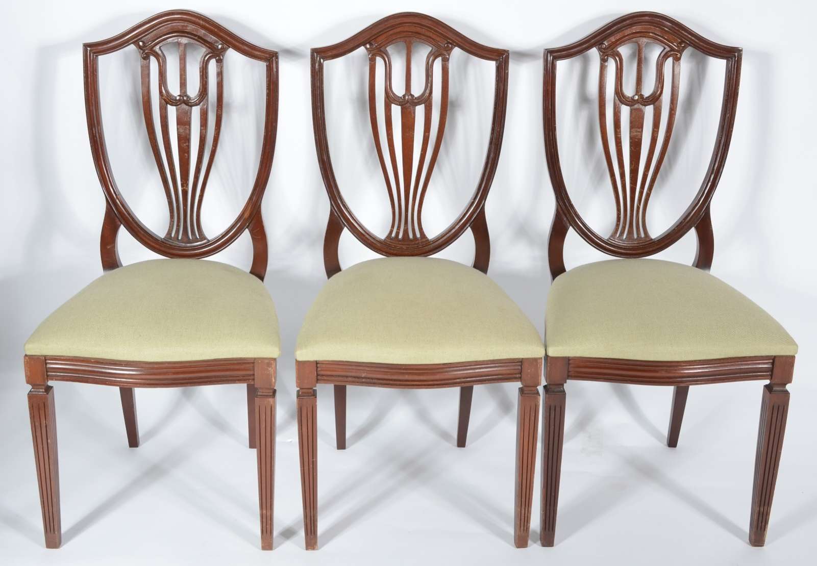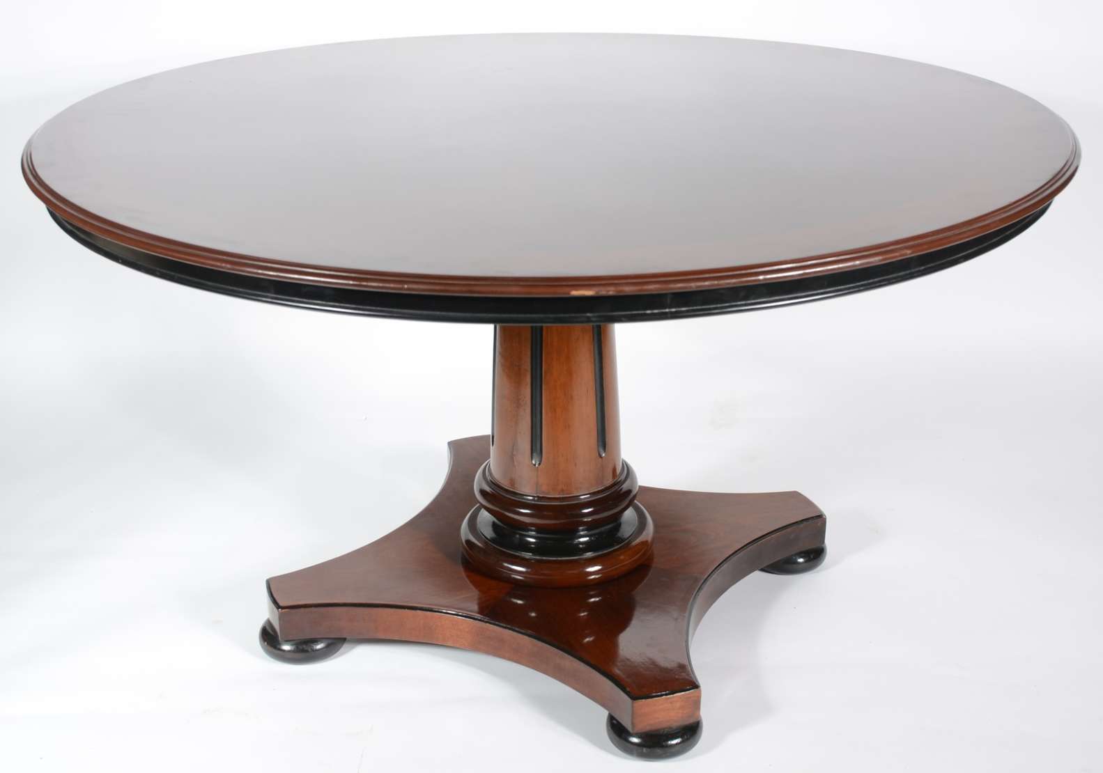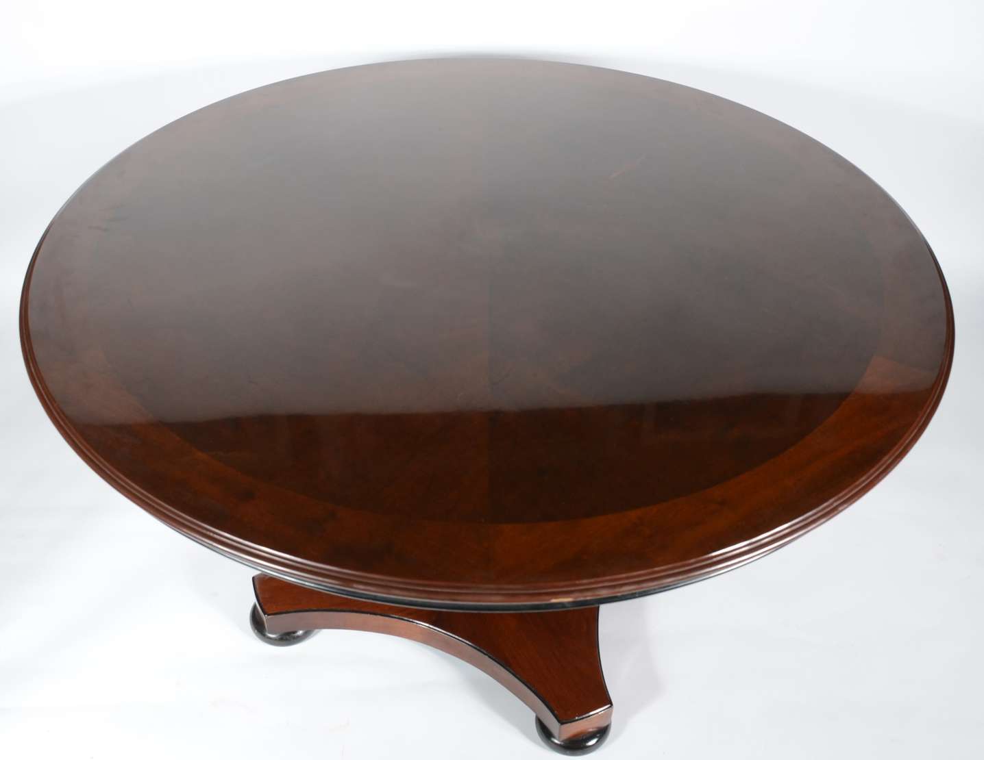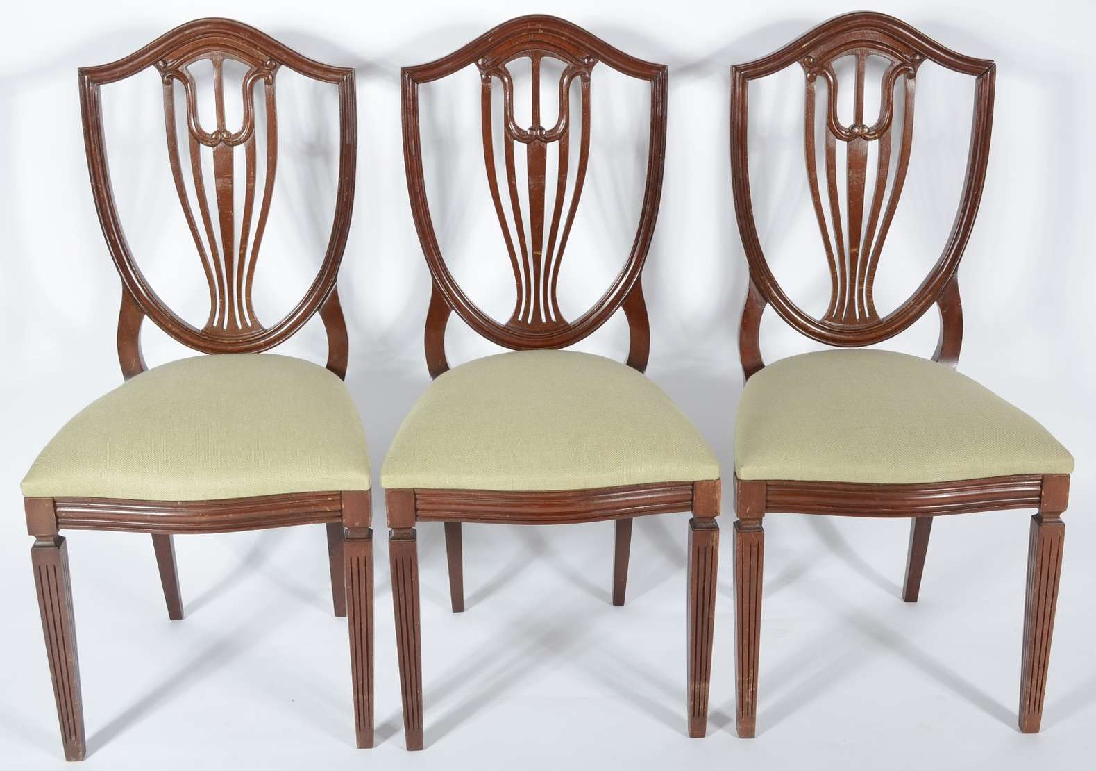 Mesa redonda de jantar de madeira nobre, apoio em coluna central frisada, base quadrangular . Acompanham 6 cadeiras com assentos estofados, estilo inglês. Desgastes na madeira, uma delas esta "bamba", precisando de reparos.