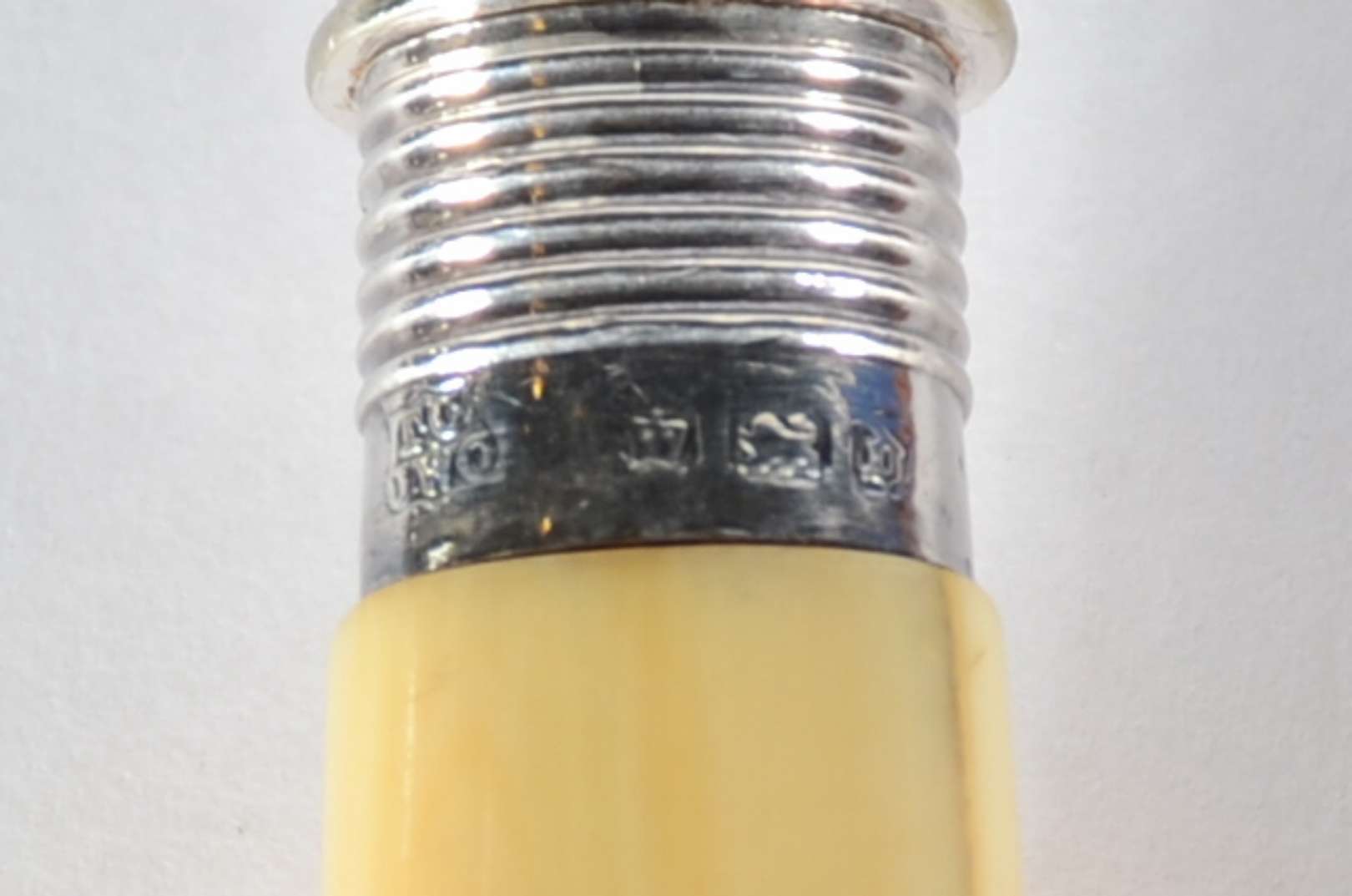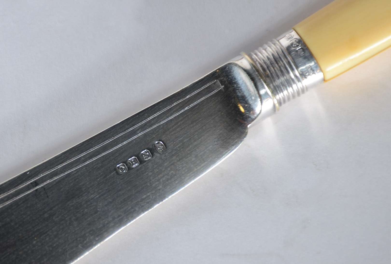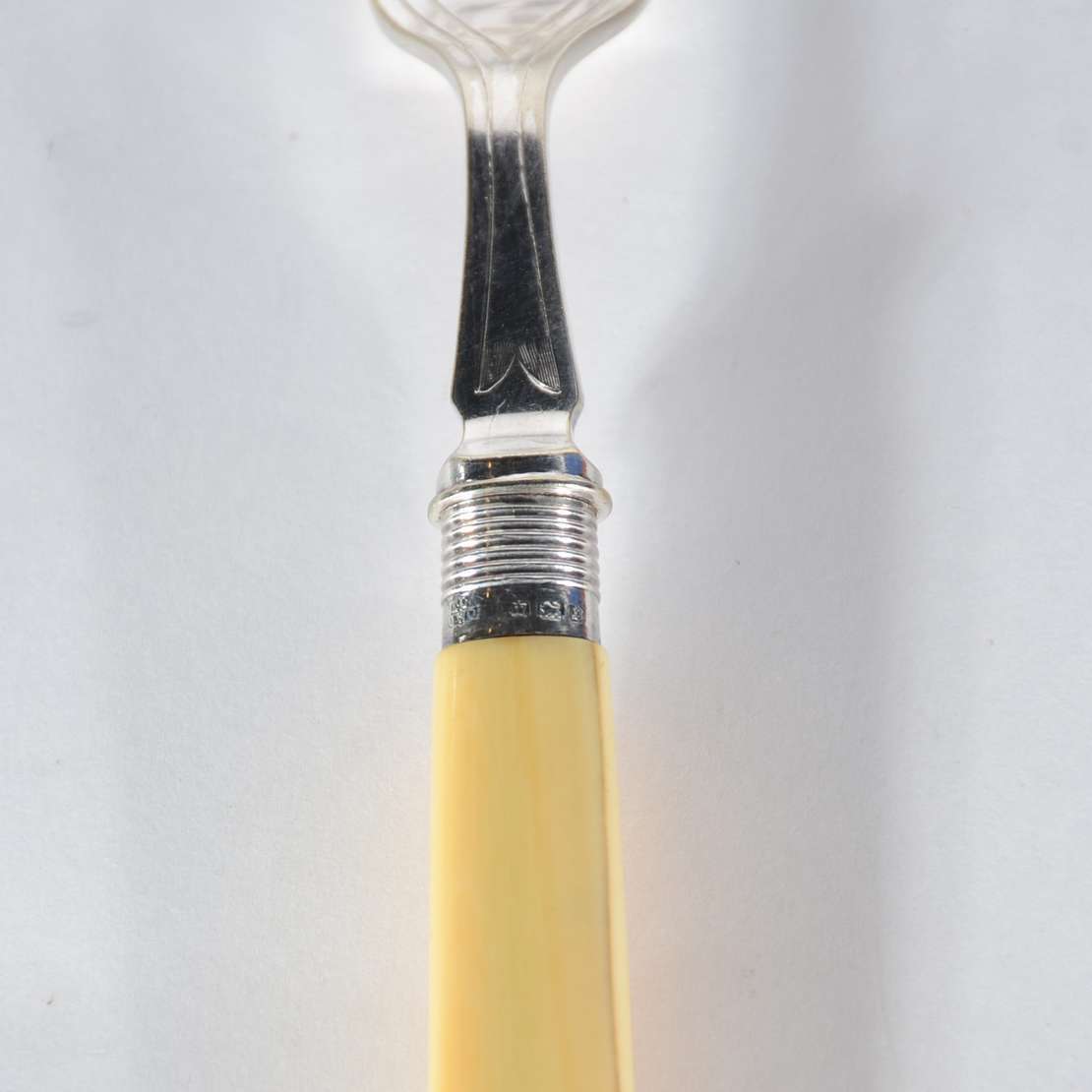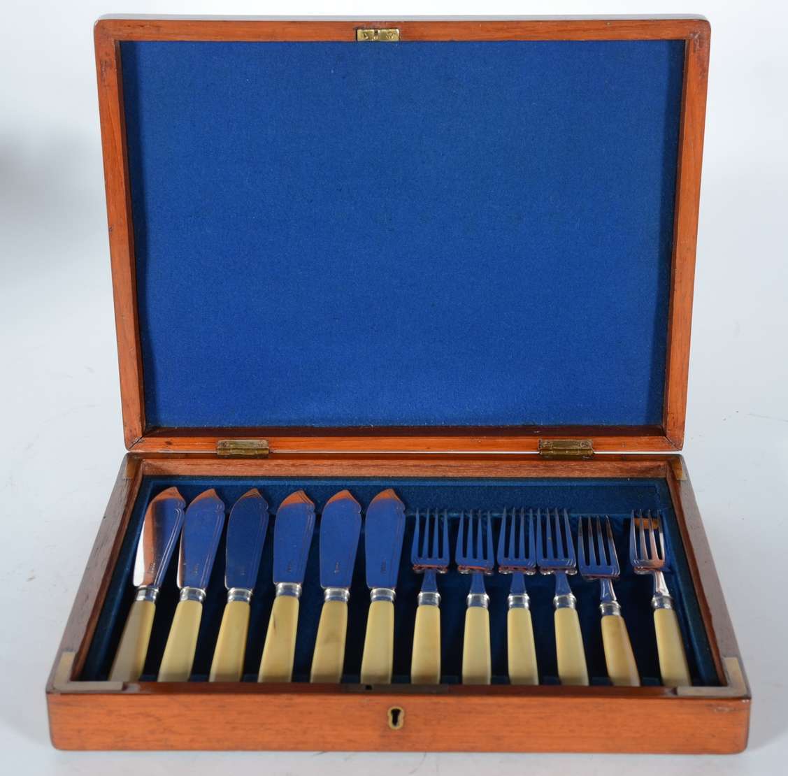 Conjunto de talheres para peixe composto de: 6 garfos e 6 facas de metal com cabo de marfim. No estojo.