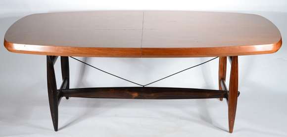 Mesa de jantar de madeira nobre, pés de madeira maciça ligados por haste de latão, tampo folheado com tábua extensora...