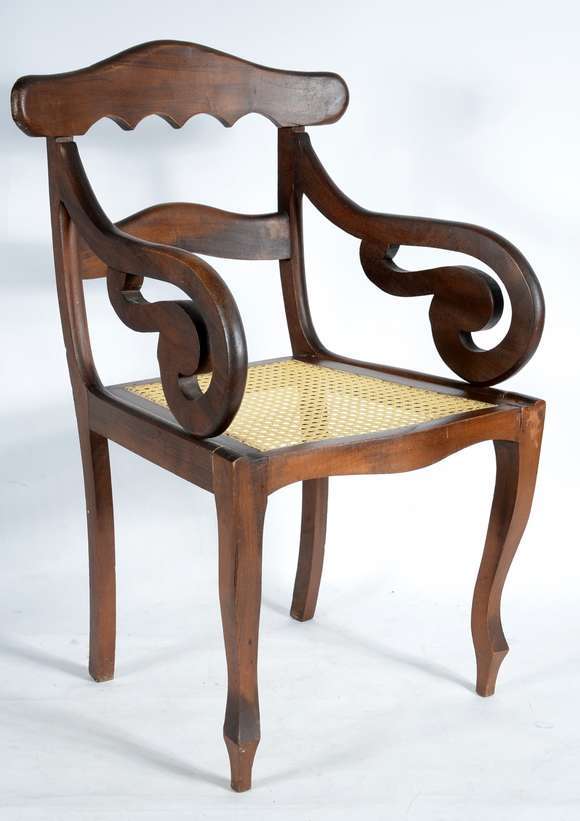 Cadeira com braços dita "rabo de macaco" de jacarandá, assento de palhinha sintética.