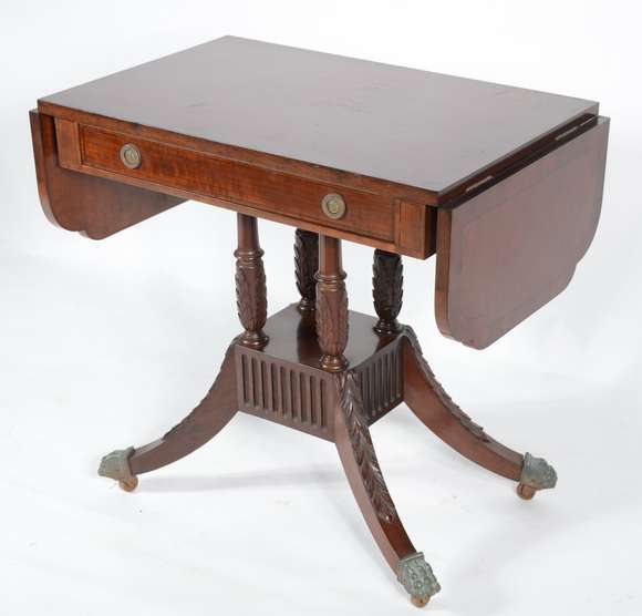 Mesa de madeira nobre com abas laterais, uma gaveta, apoio em 4 colunetas torneadas sobre base quadrangular de onde p...