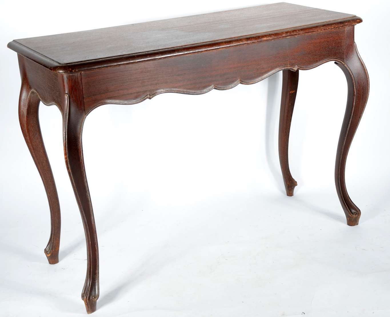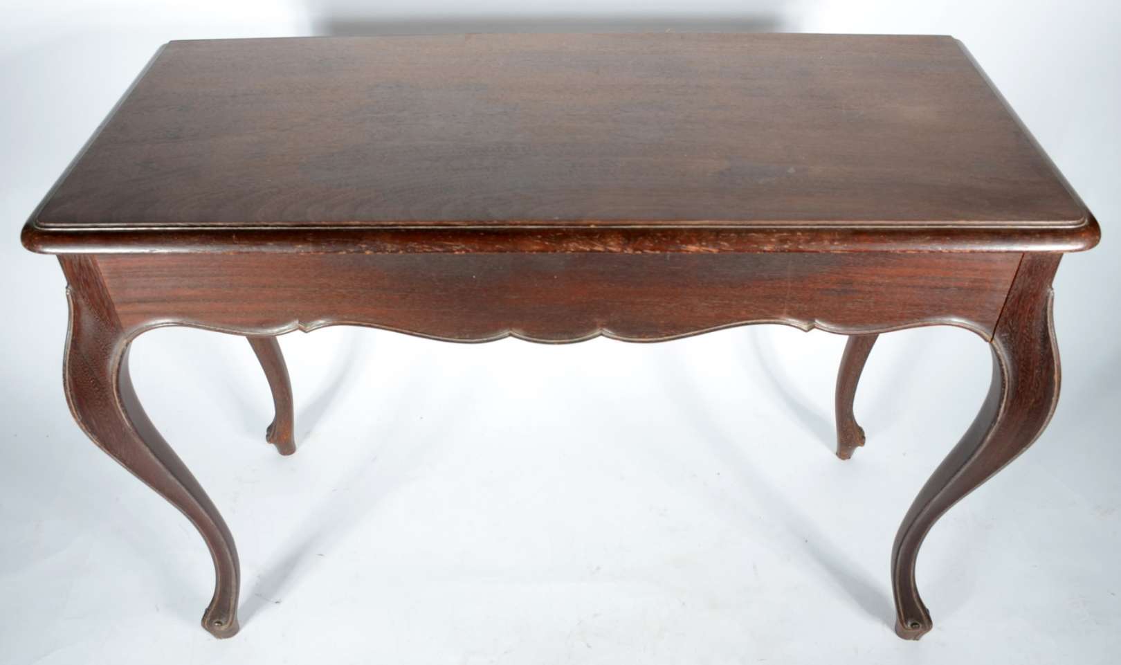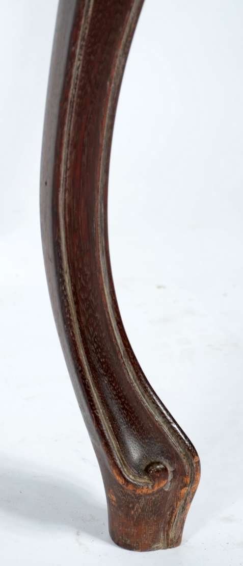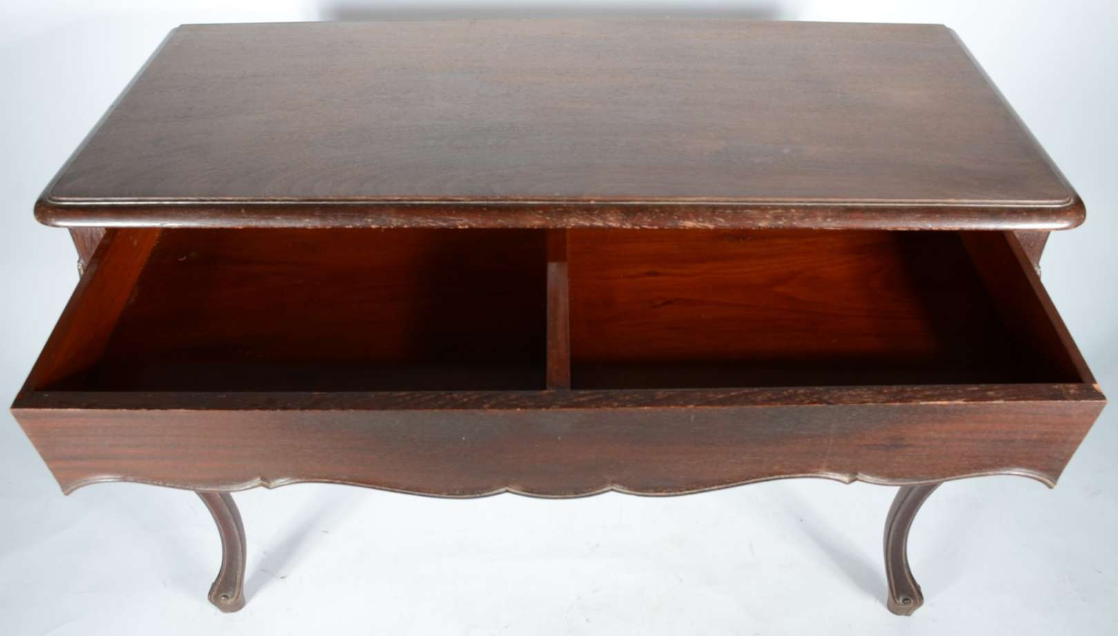 Aparador de madeira nobre, tampo retangular apoiado em coluna feitio "lira, terminando em quatro pernas recurvas.