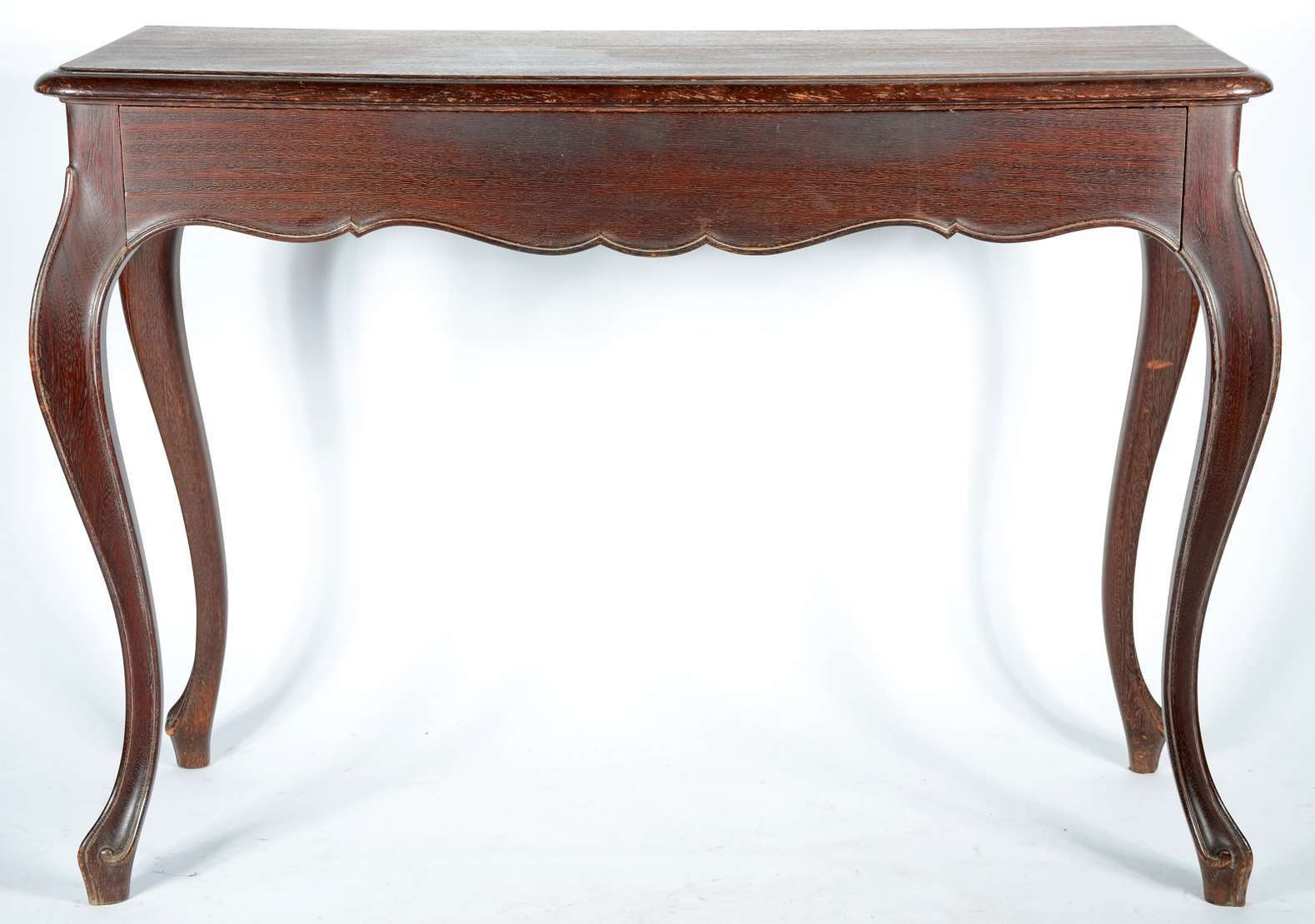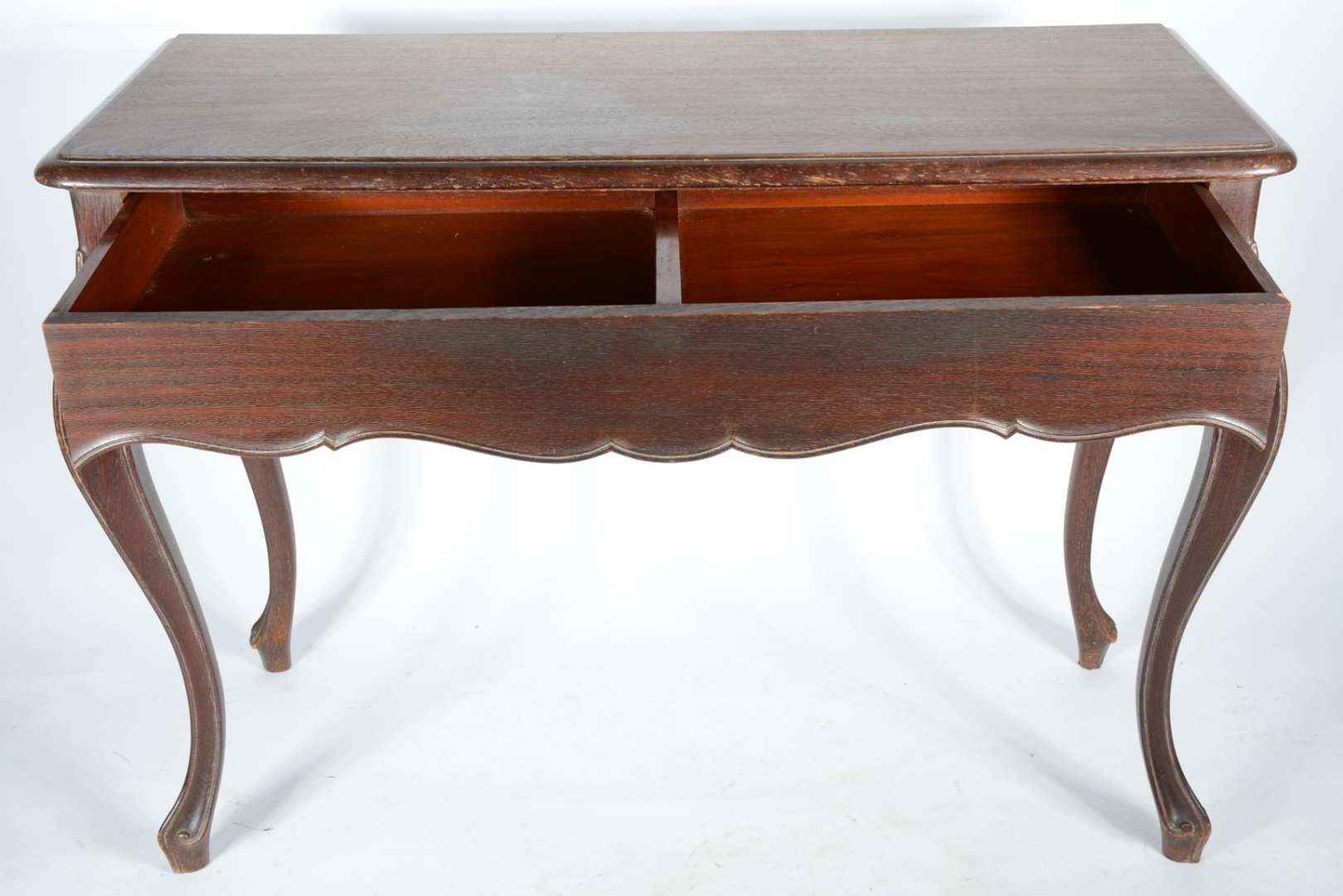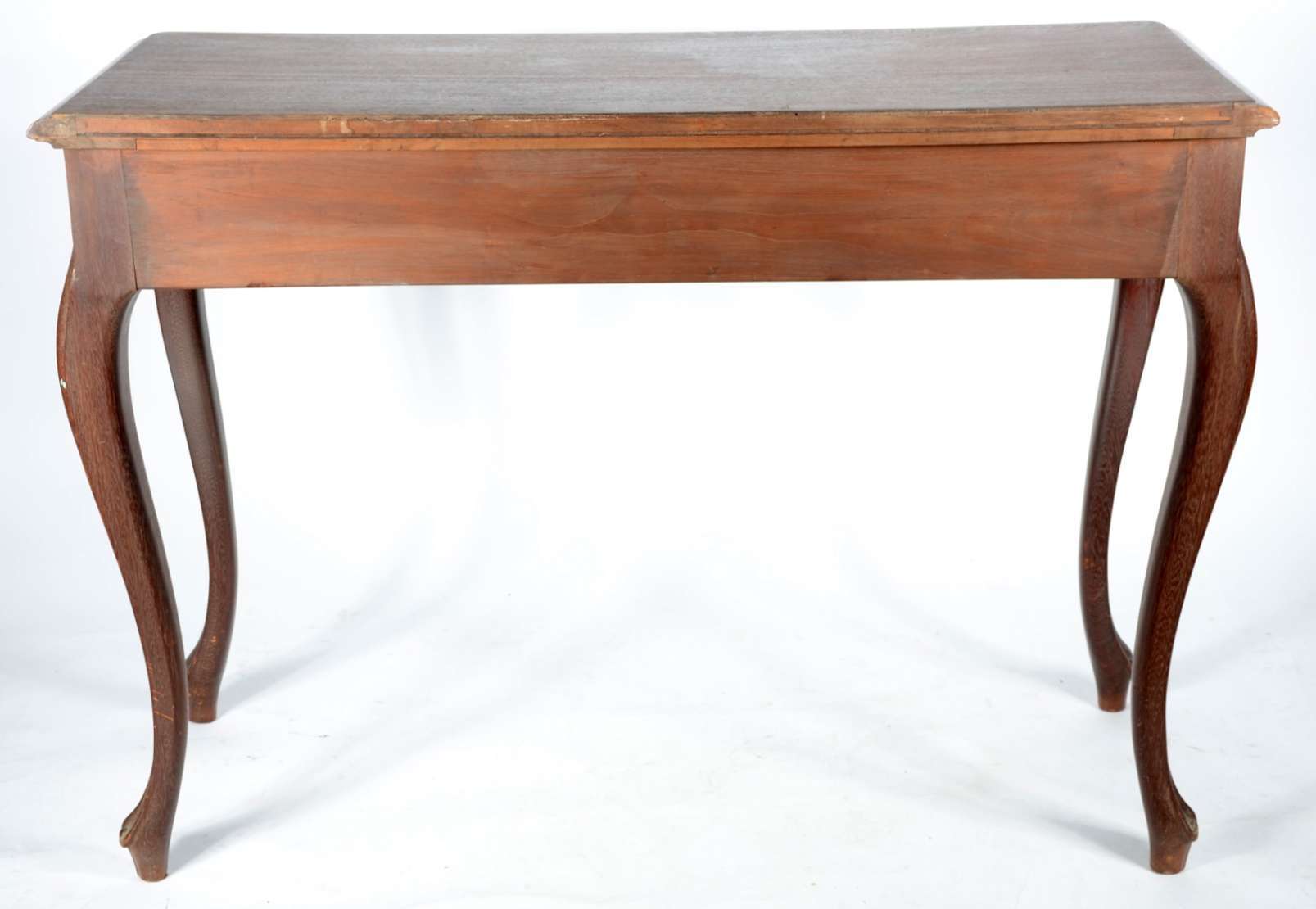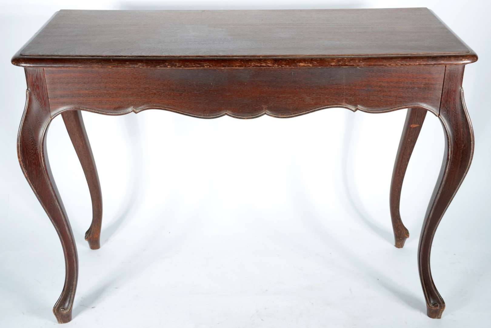 Aparador de madeira nobre, tampo retangular apoiado em coluna feitio "lira, terminando em quatro pernas recurvas.