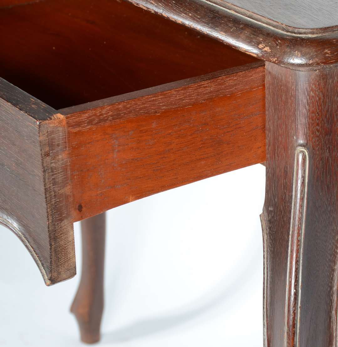 Duas mesas auxiliares de madeira nobre, uma delas com detalhes torneados e a outra com cinco gavetinhas e puxadores d...