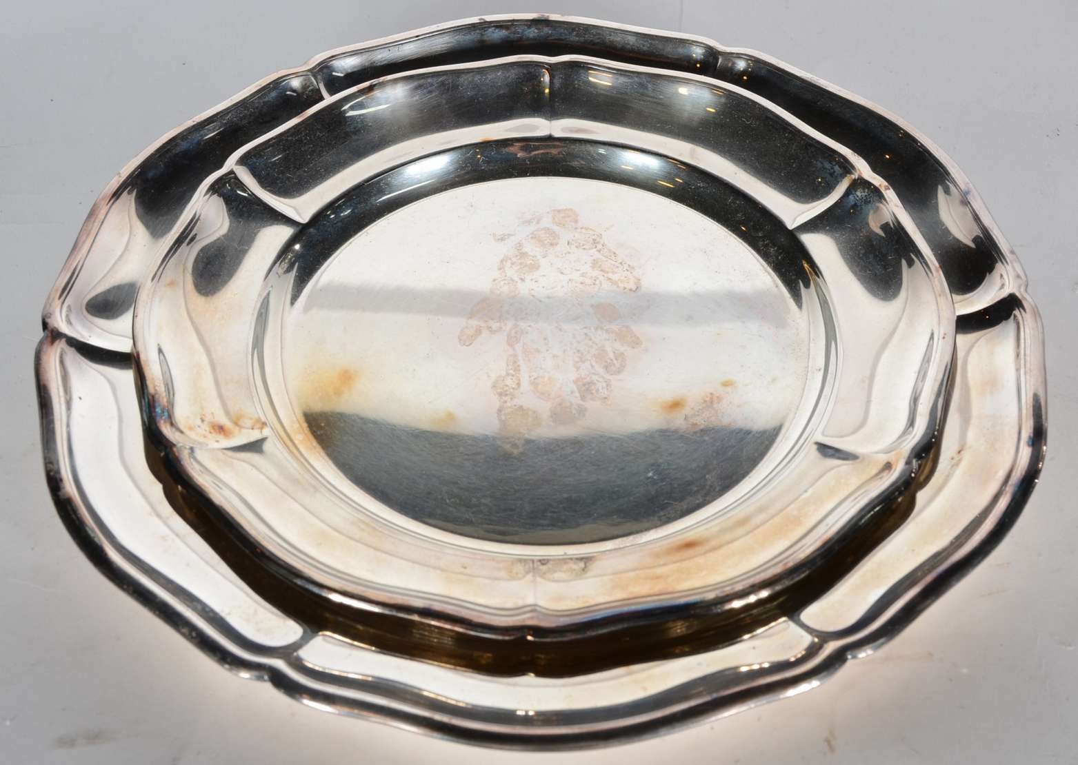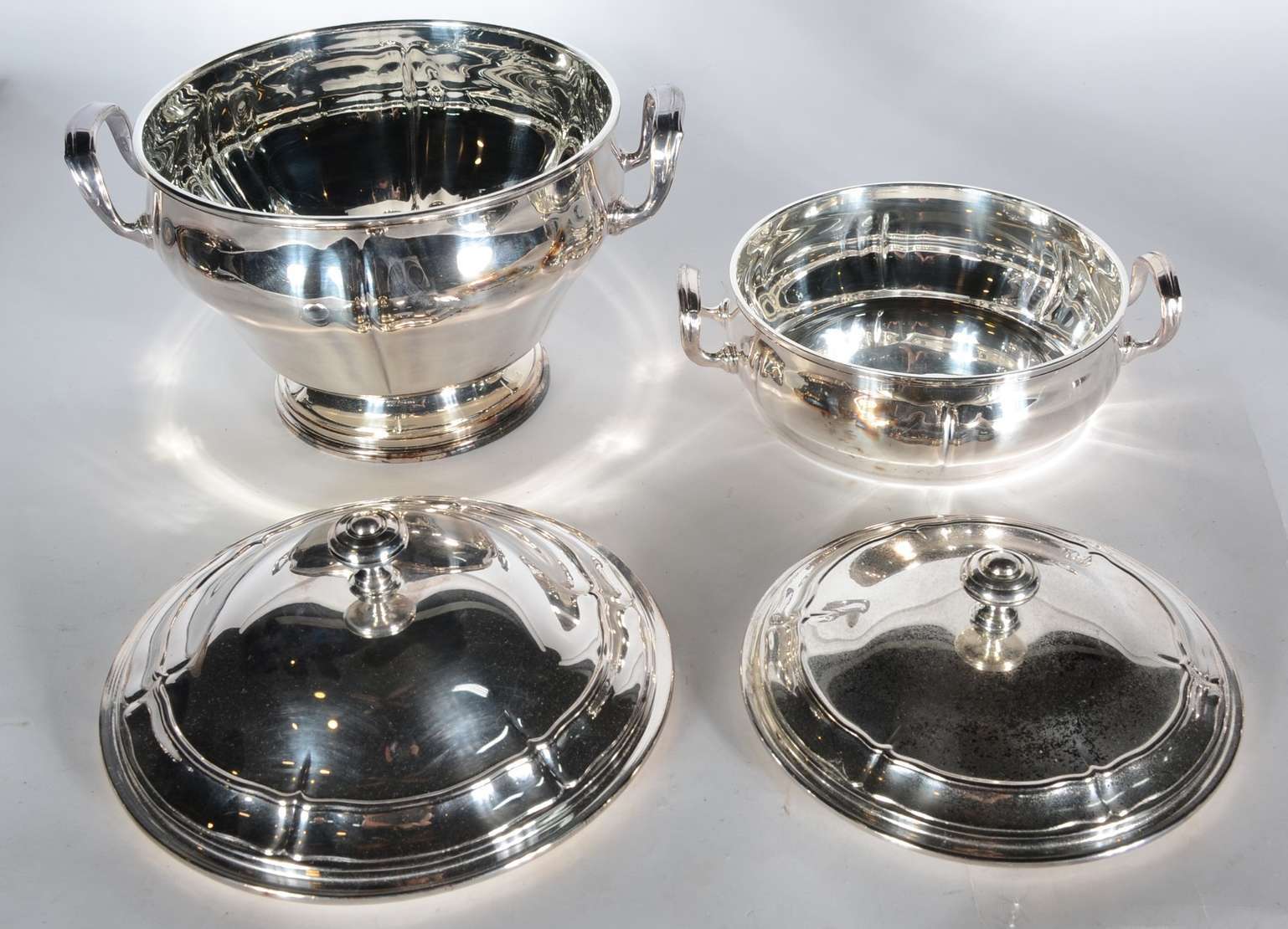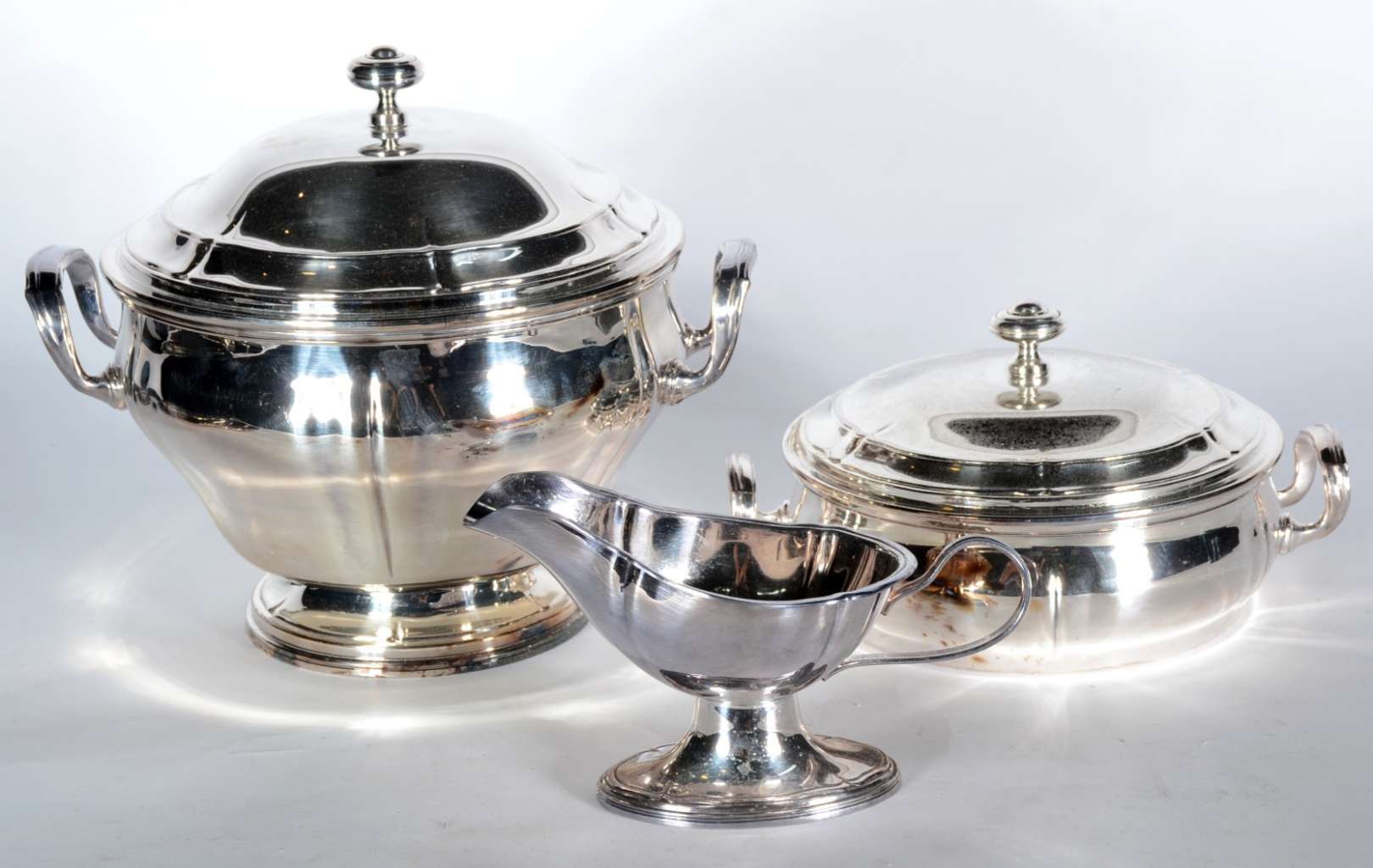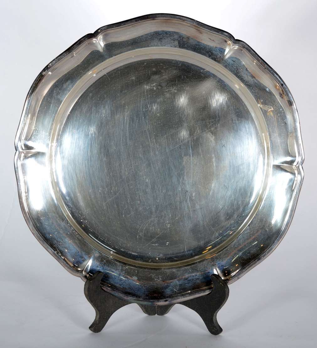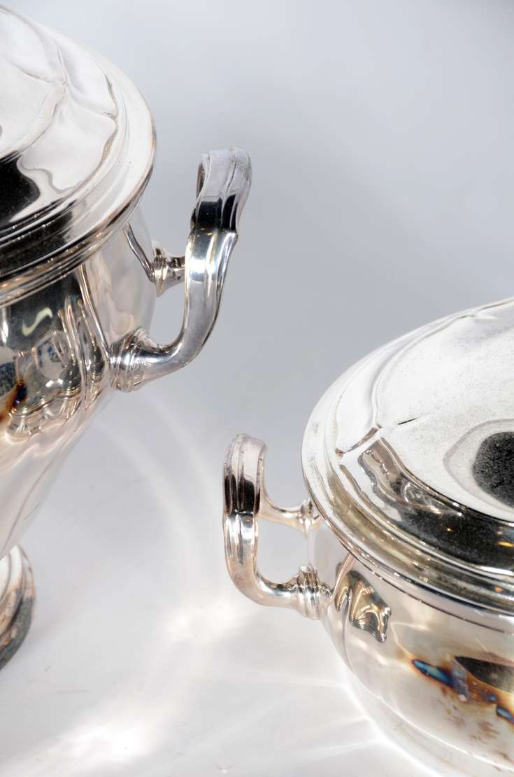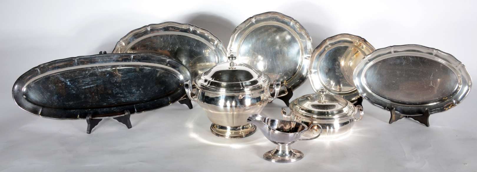 Baixela de jantar de metal prateado, borda recortada, composto de: sopeira, legumeira com tampa, molheira e 5 travessas. Total 8 peças. Desgastes.