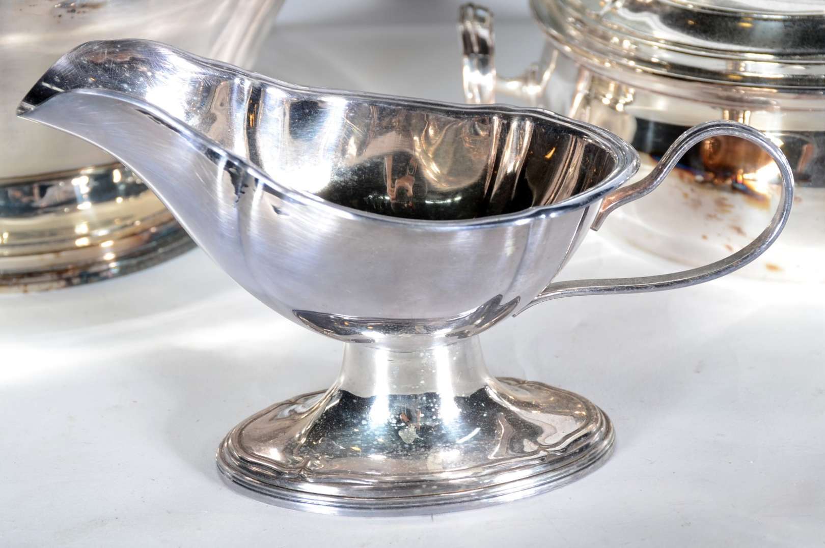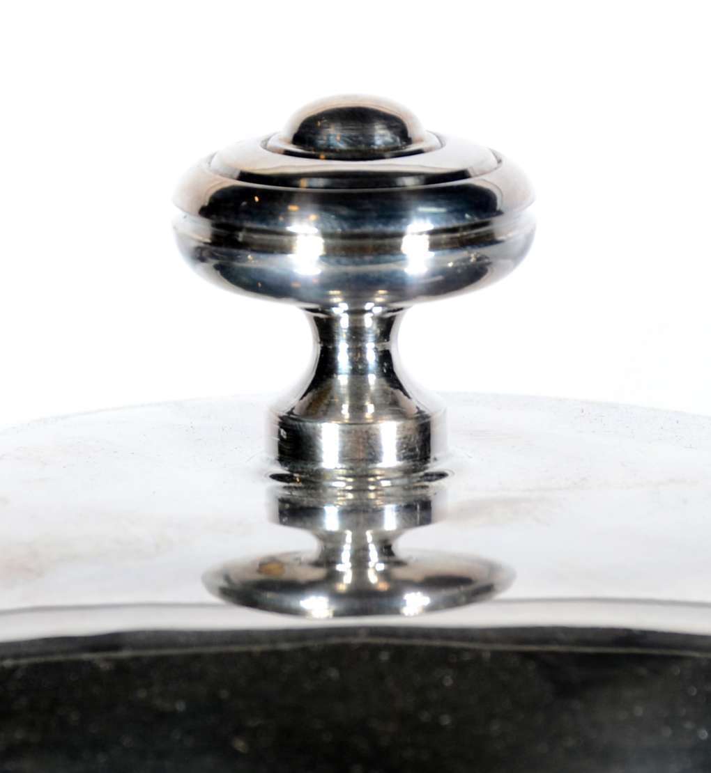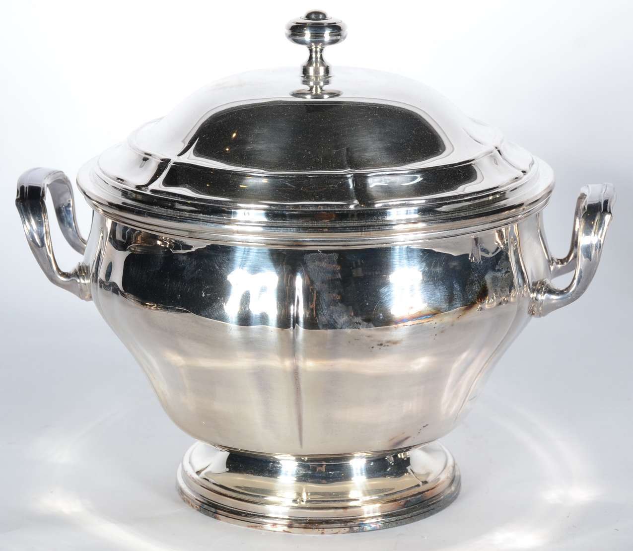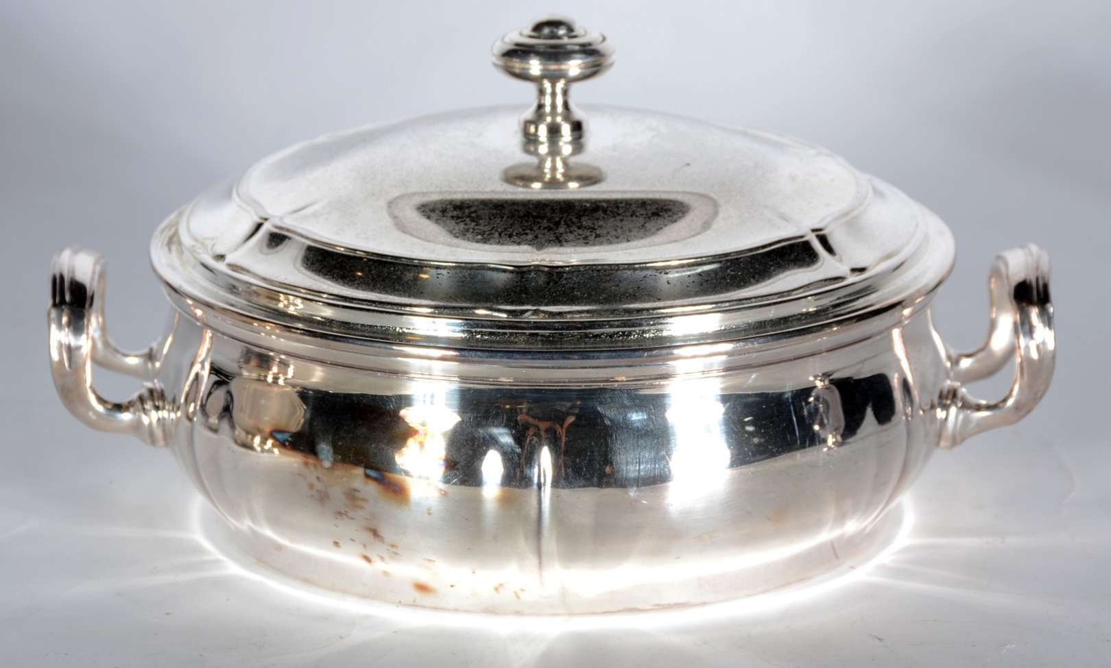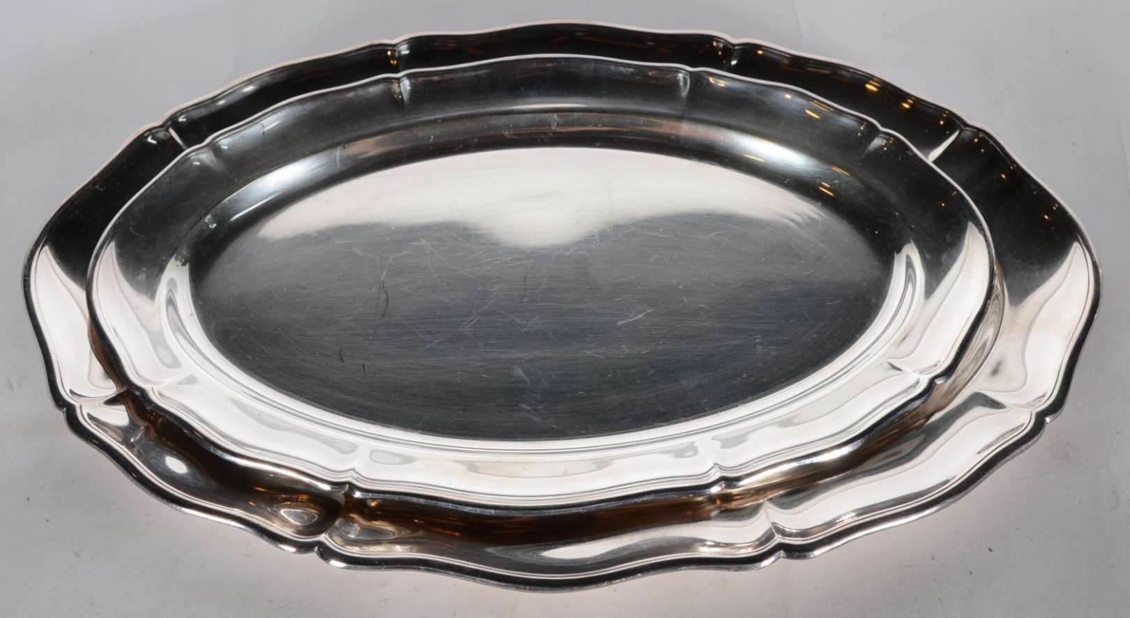 Baixela de jantar de metal prateado, borda recortada, composto de: sopeira, legumeira com tampa, molheira e 5 travessas. Total 8 peças. Desgastes.