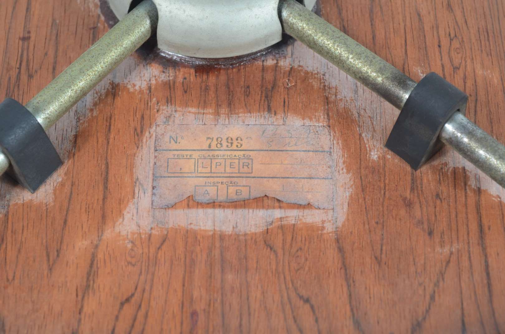 Divisória de metal patinado com tampo e base de madeira. Desgastes.