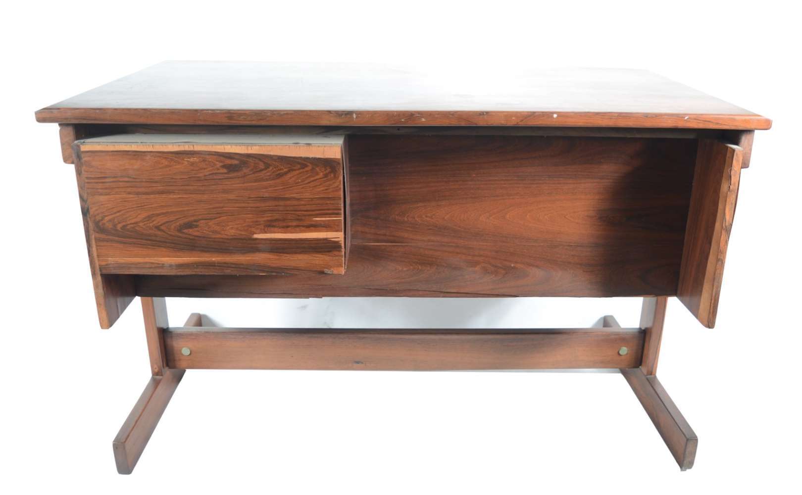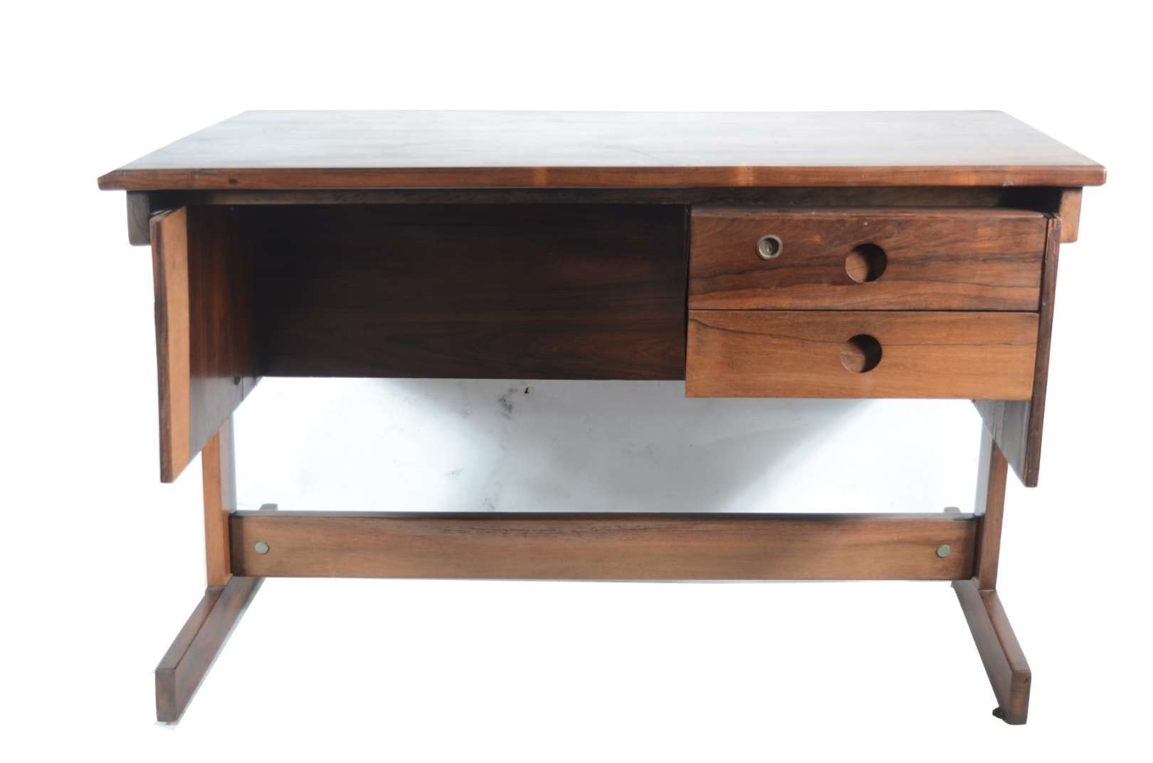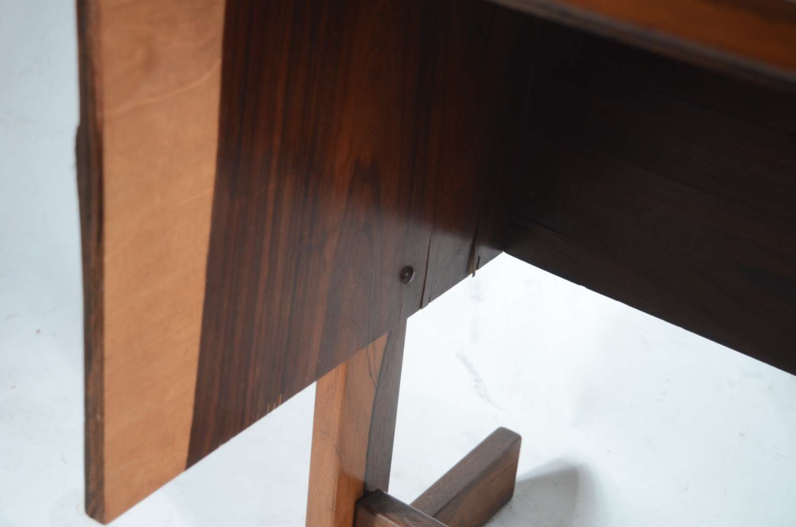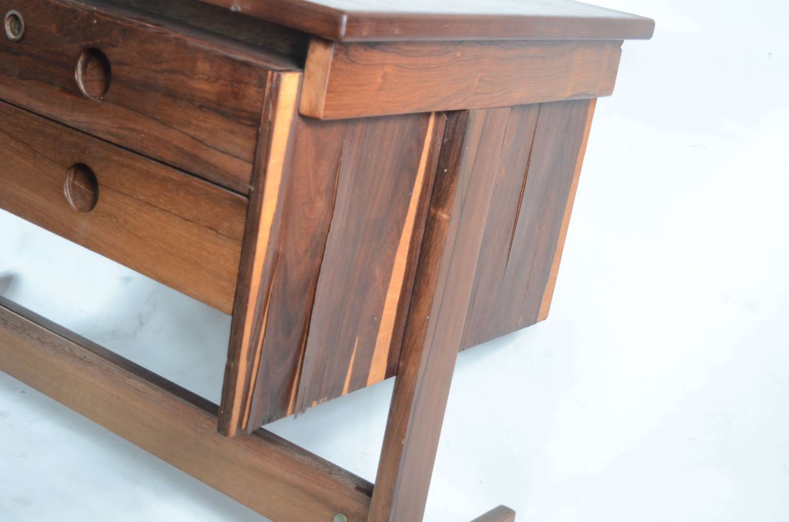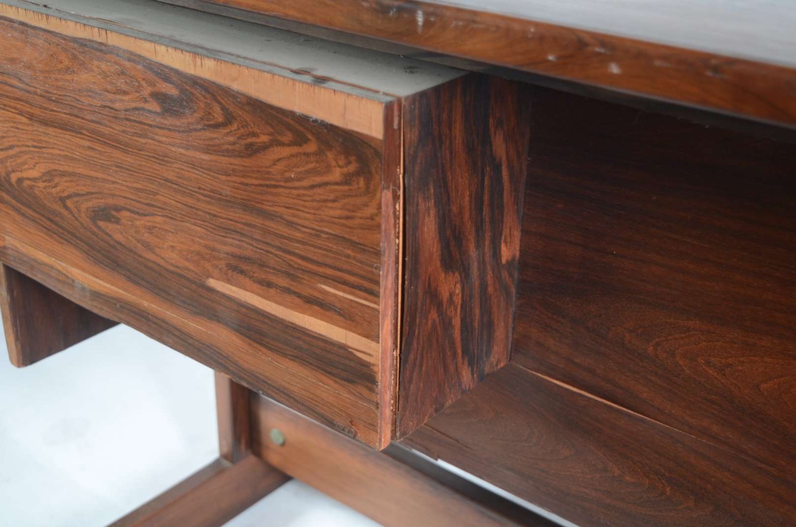 Aparador de madeira nobre, tampo retangular apoiado em coluna feitio "lira, terminando em quatro pernas recurvas.