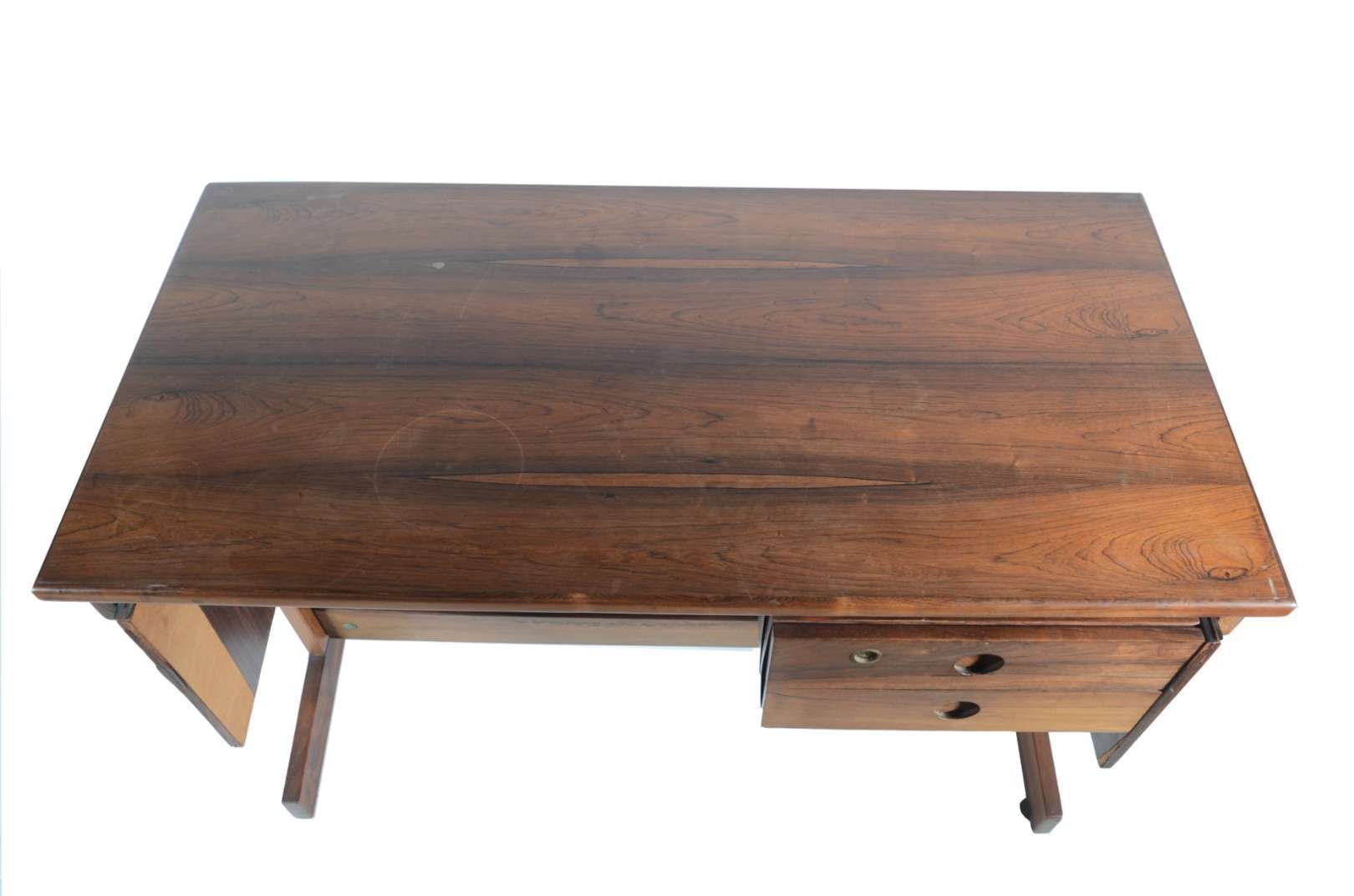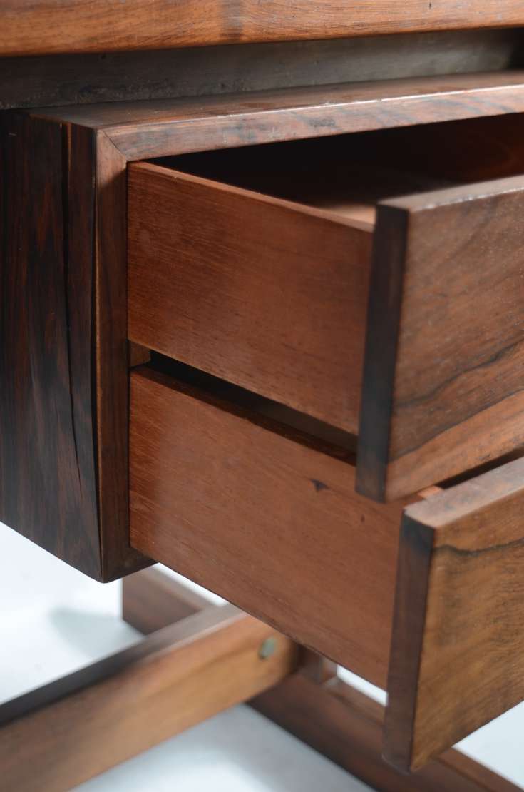 Duas mesas auxiliares de madeira nobre, uma delas com detalhes torneados e a outra com cinco gavetinhas e puxadores d...