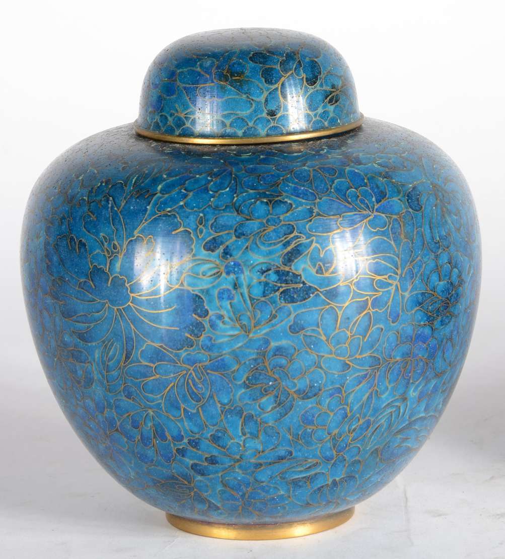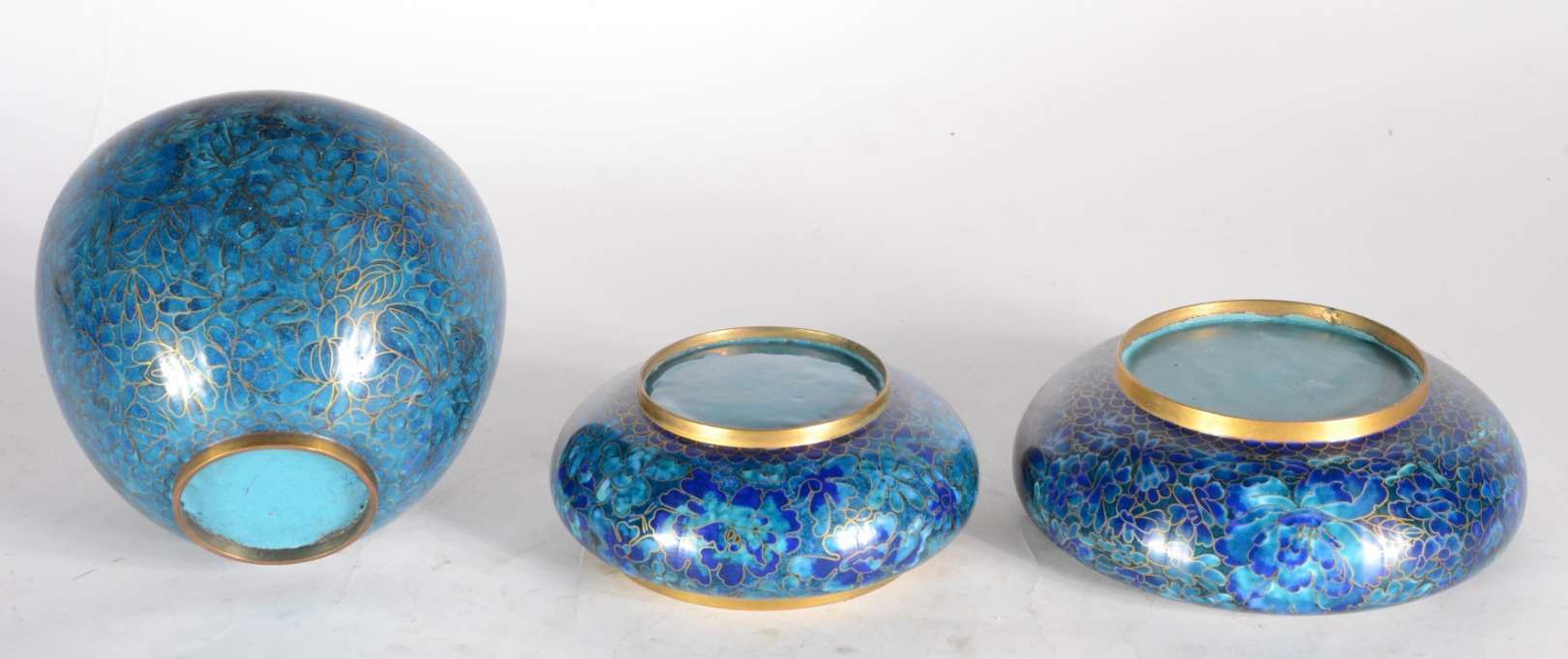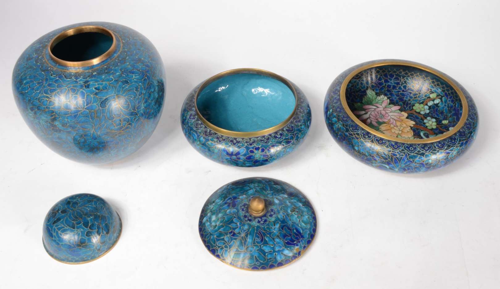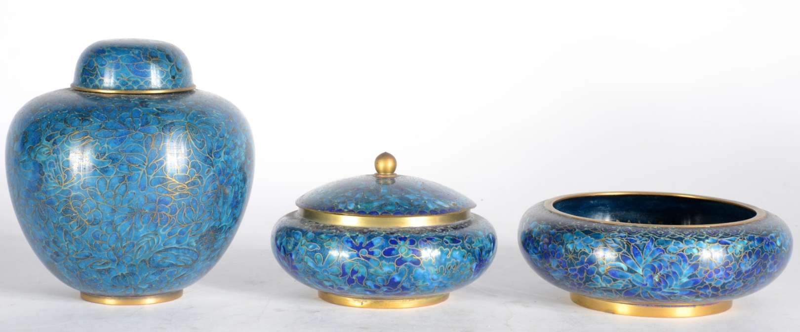 Três peças diversas, sendo: floreira de cerâmica branca (craquelê) e par de potiches de porcelana oriental azul e bra...