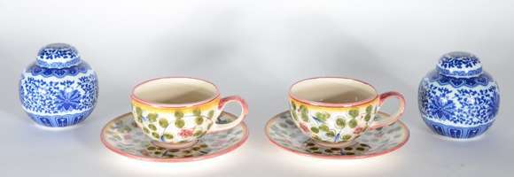 Diversas peças, sendo: dois potiches de porcelana azul e branco; e, 2 xícaras com pires para consome de cerâmica Luis...