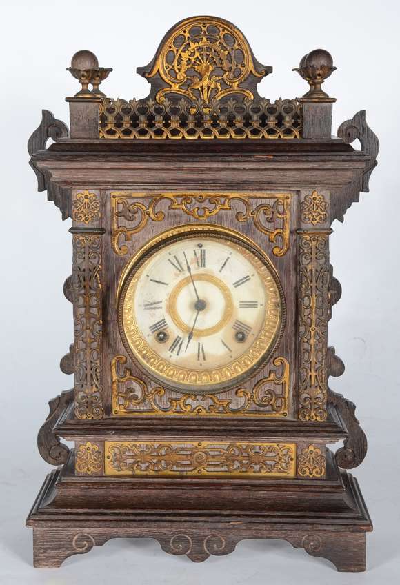 Antigo relógio americano de mesa, dito "mantel clock", caixa de madeira com aplicações de metal dourado. Mostrador co...