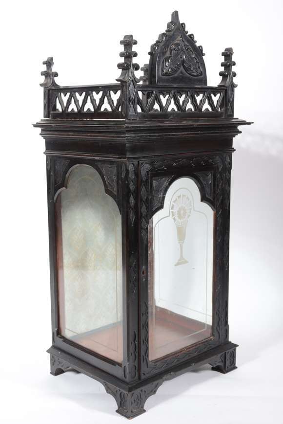 Oratório de madeira nobre, porta e laterais de vidro, parte superior com "gradinha" e placa central entalhada. Sem en...