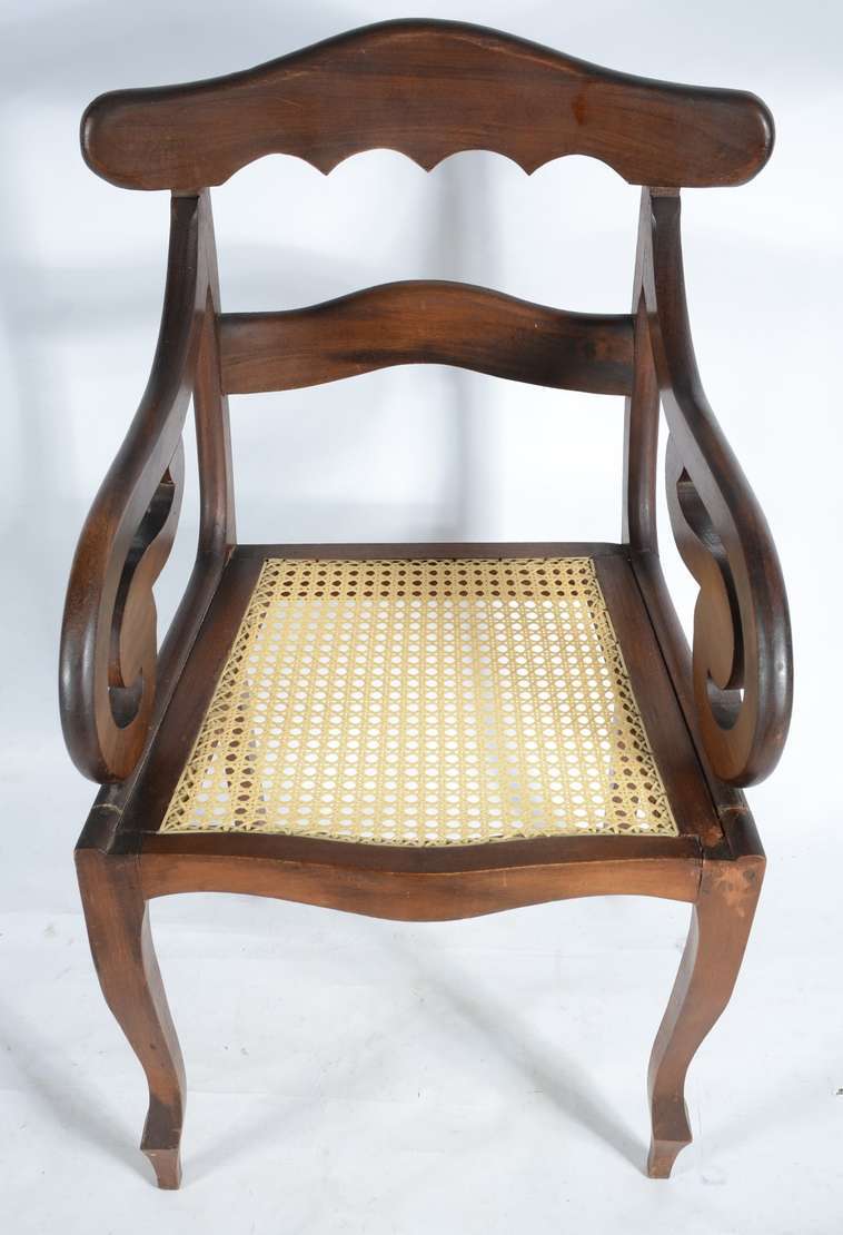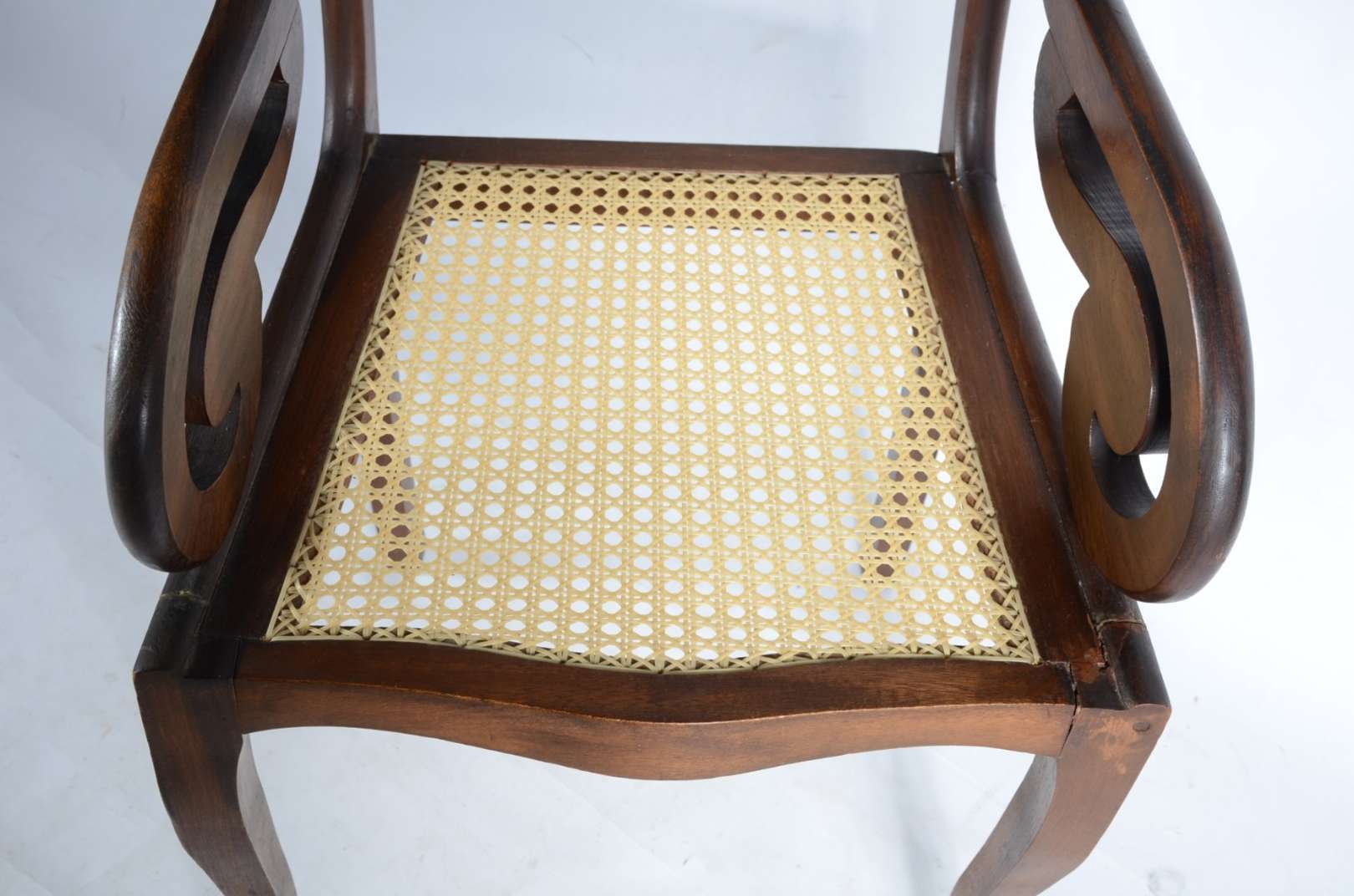 Par de elegantes cadeiras com braços de madeira nobre, estilo Luis XV, estofamento recém feito forrado com tecido beg...