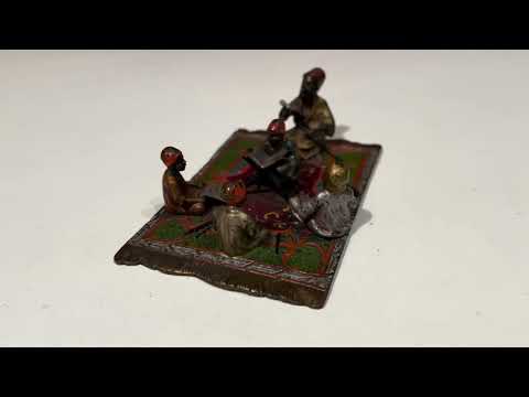 Três peças de bronze, sendo: almofariz, placa com anjo e dois cachorros em relevo e cinzeiro com figuras no fundo.