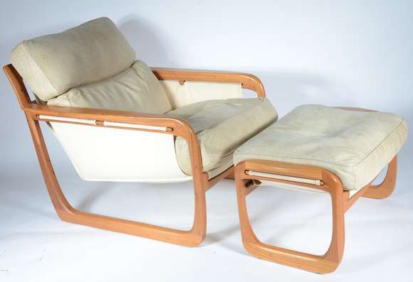 Chaise e banqueta modelo "Pitu" em madeira maciça com assento e encosto estofados e estrutura em lona.