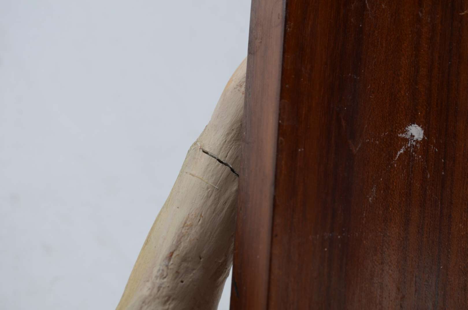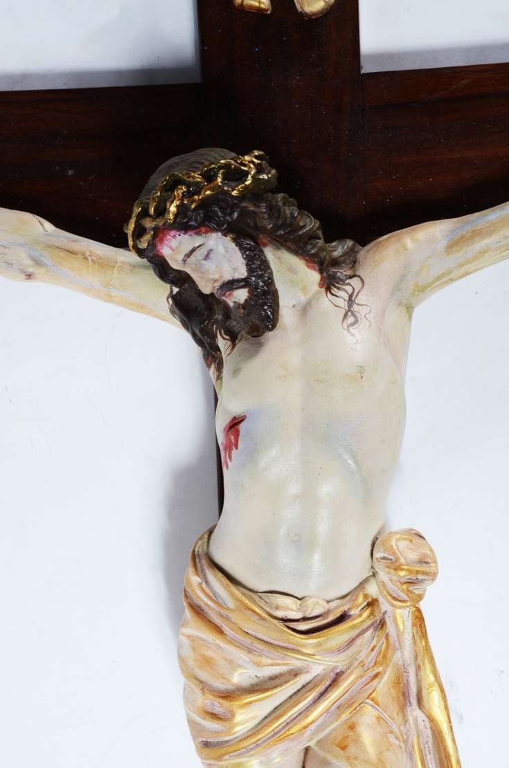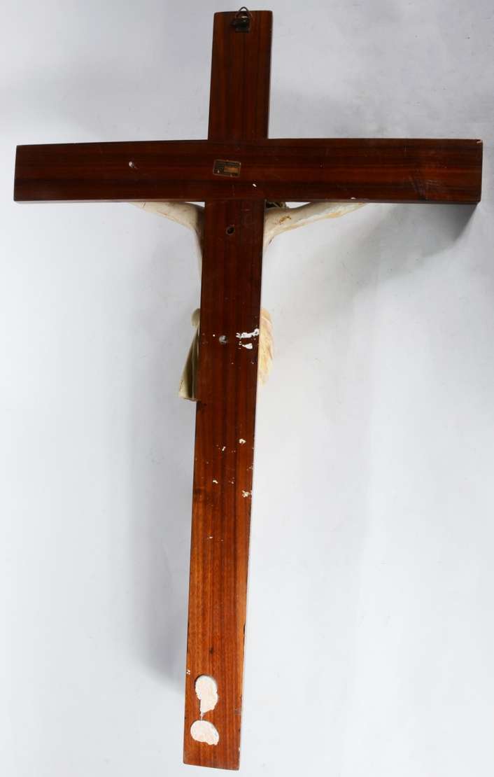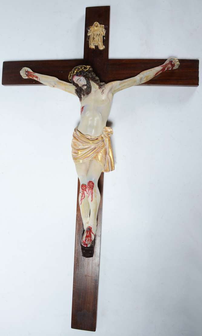 Crucifixo de madeira com figura de Cristo de gesso policromado. Desgastes.
