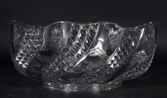 Fruteira de cristal francês lapidado, borda recortada. Marca da cristallerie em relevo.