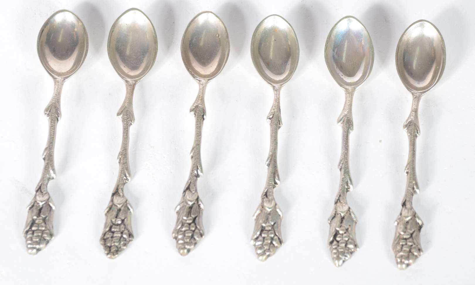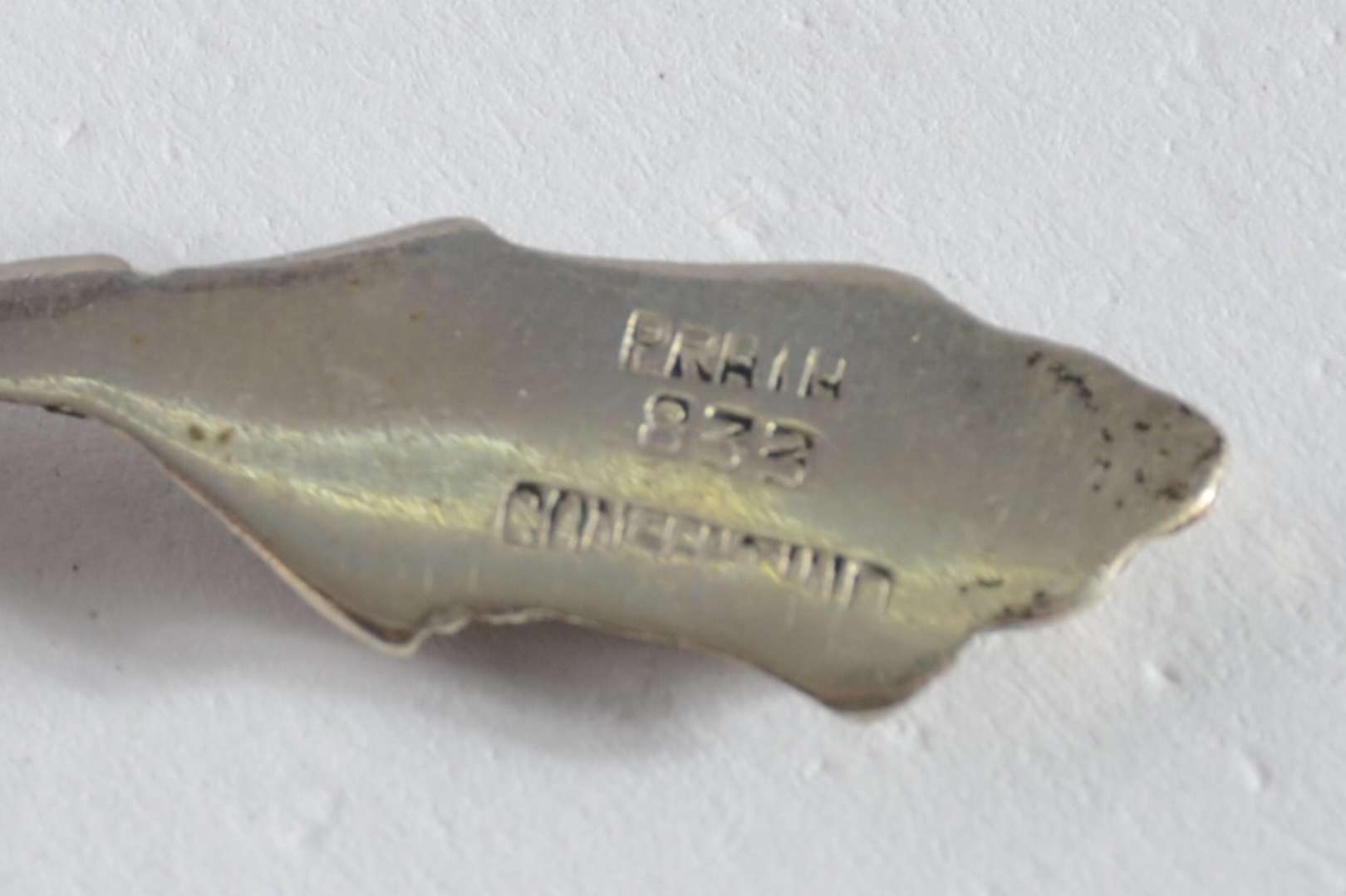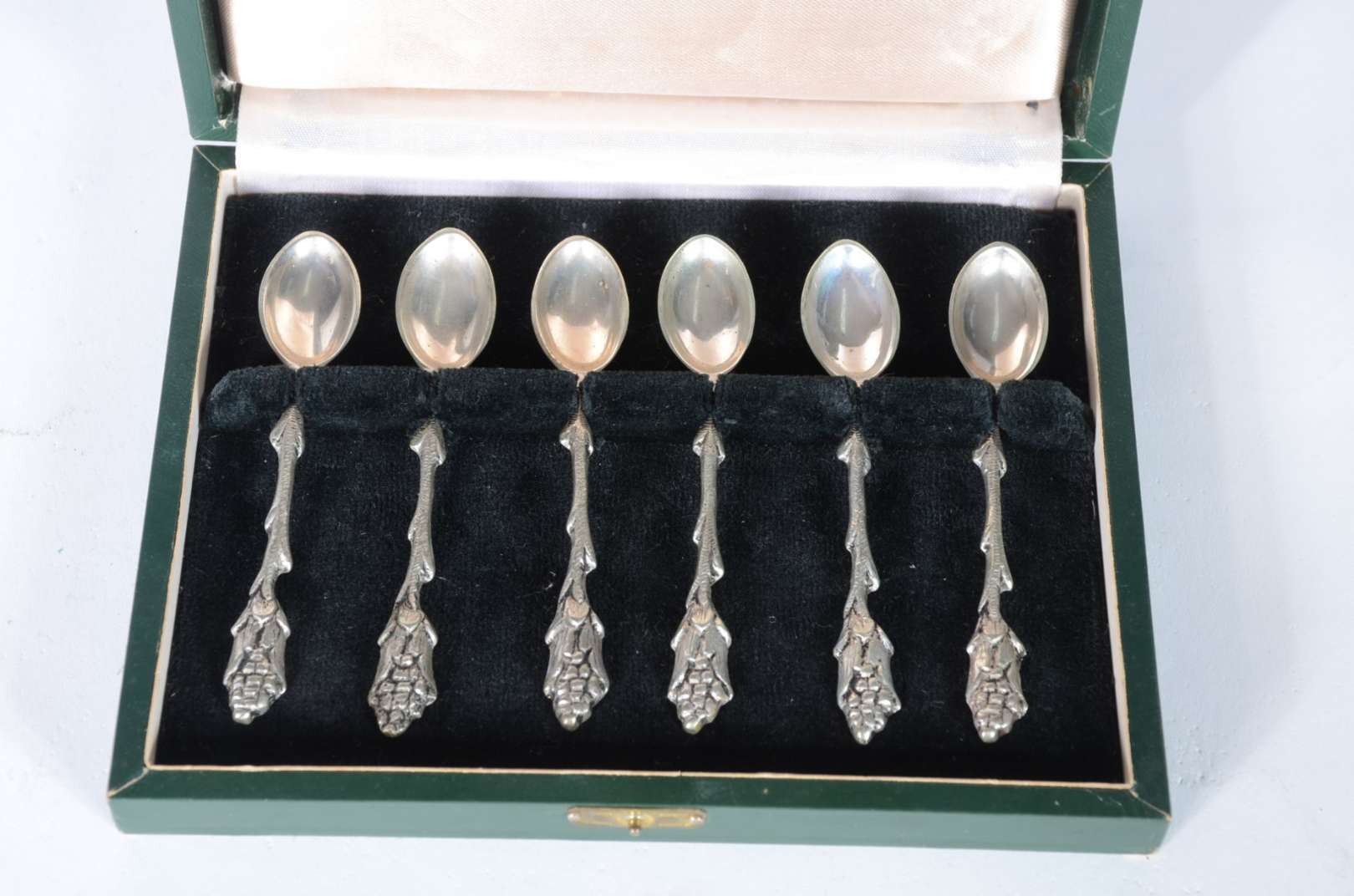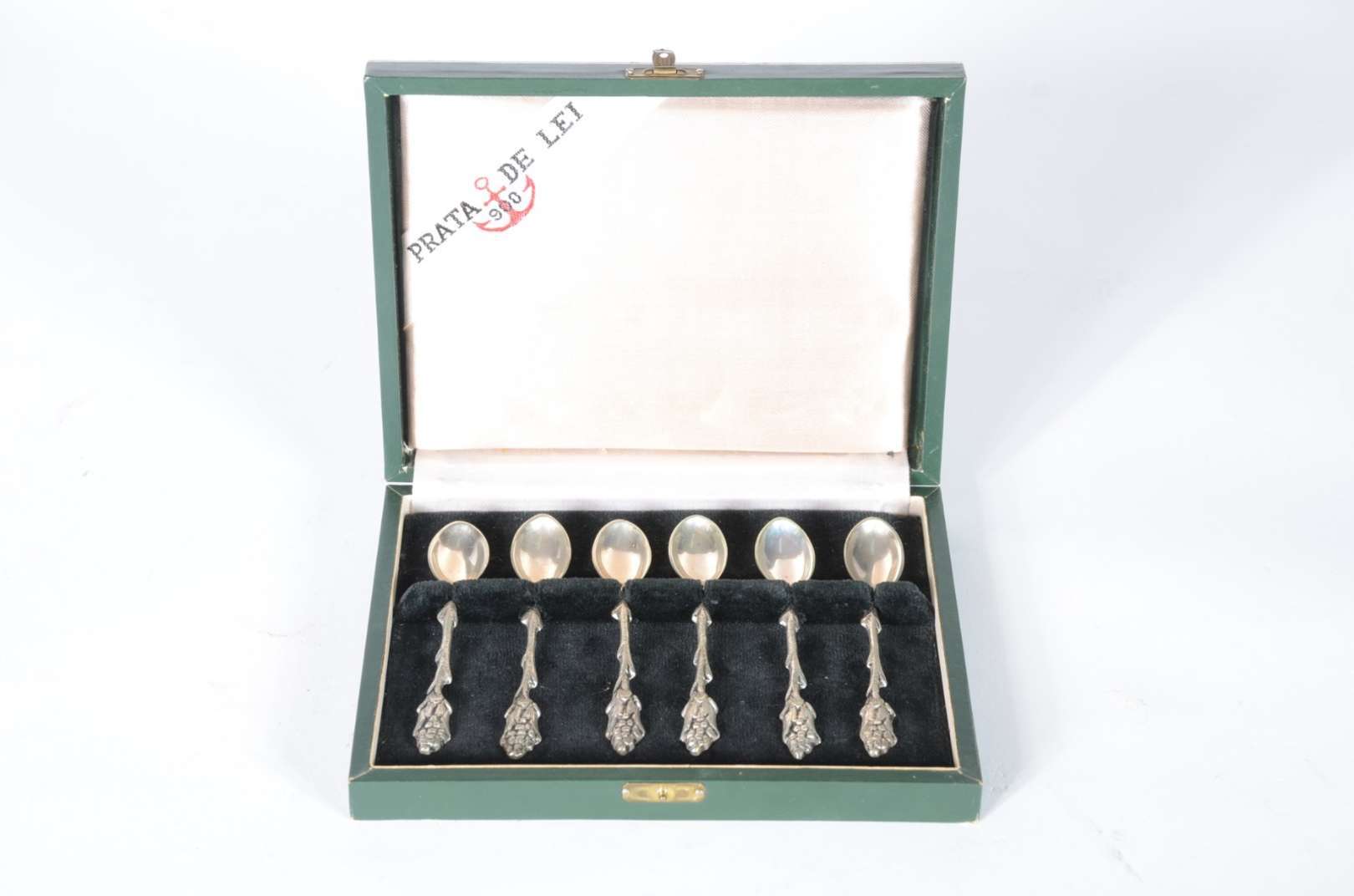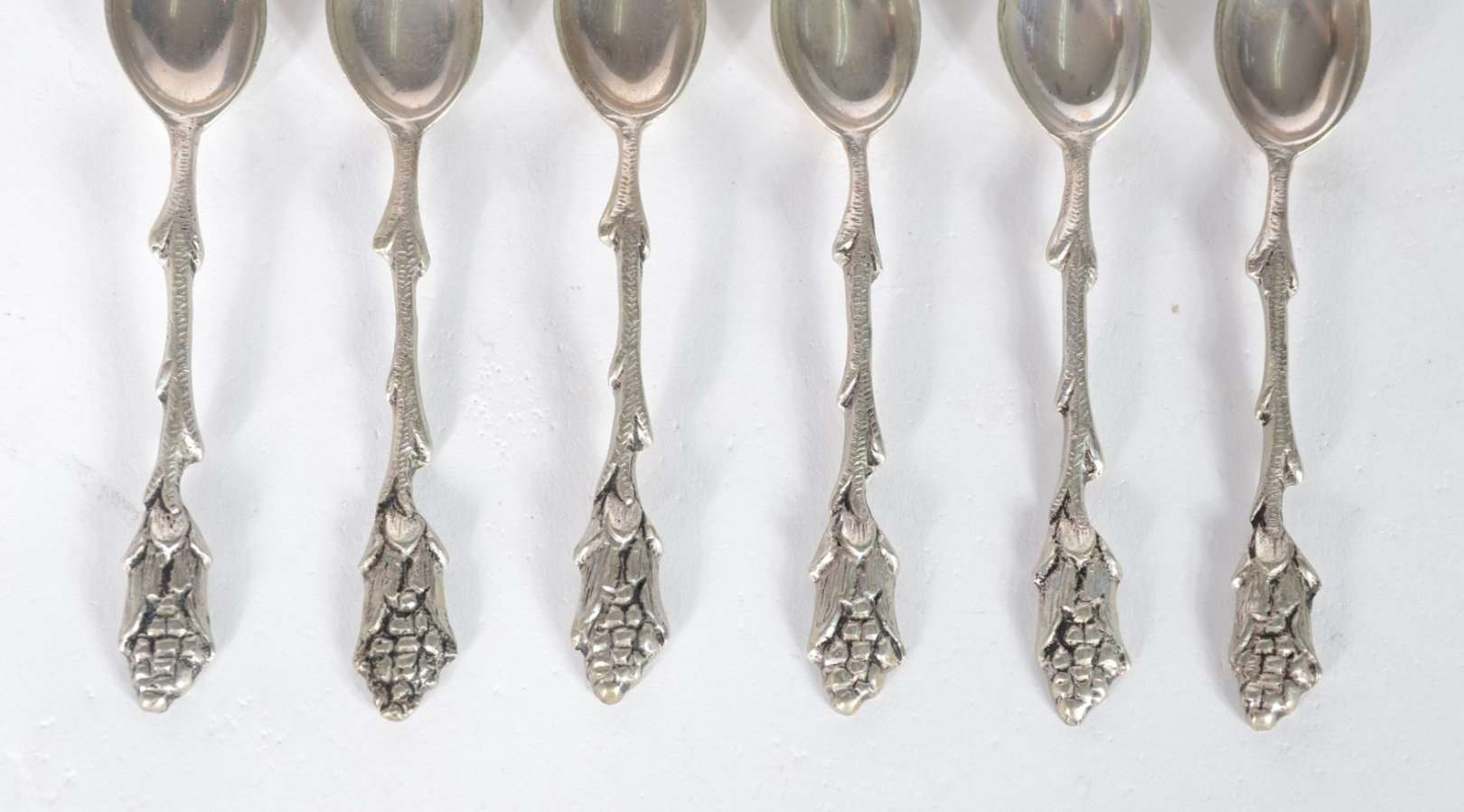 Conjunto com 12 colheres para café e uma para açucar, de prata contrastada. No estojo. Peso da prata: 90 g. (Por mot...