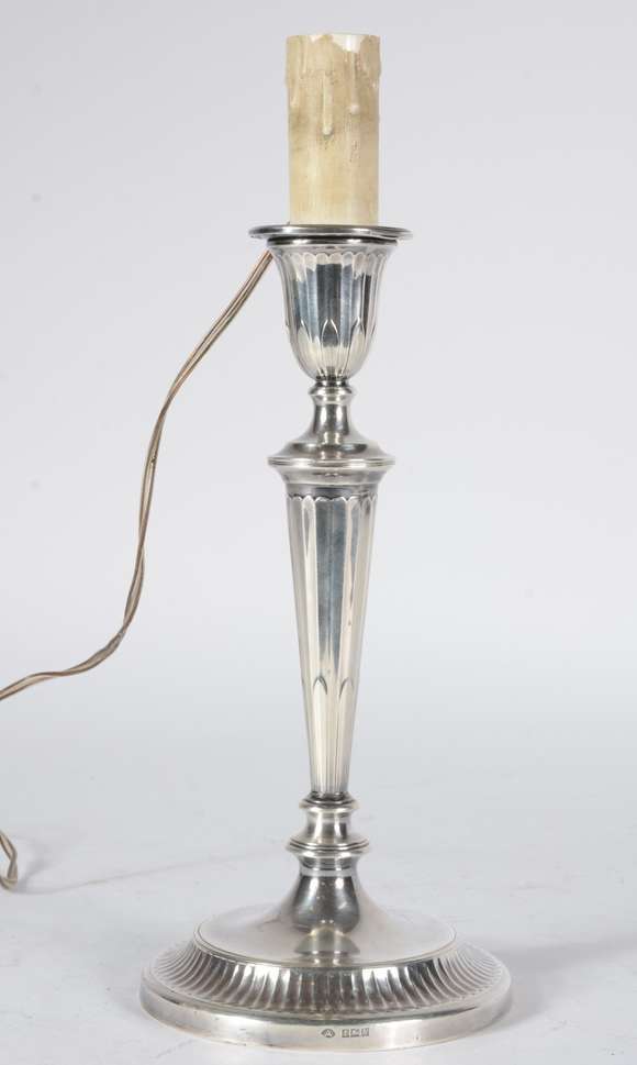 Castiçal de prata inglesa contrastada, adaptado para abatjour. Peso total com enchimento: 950 g.