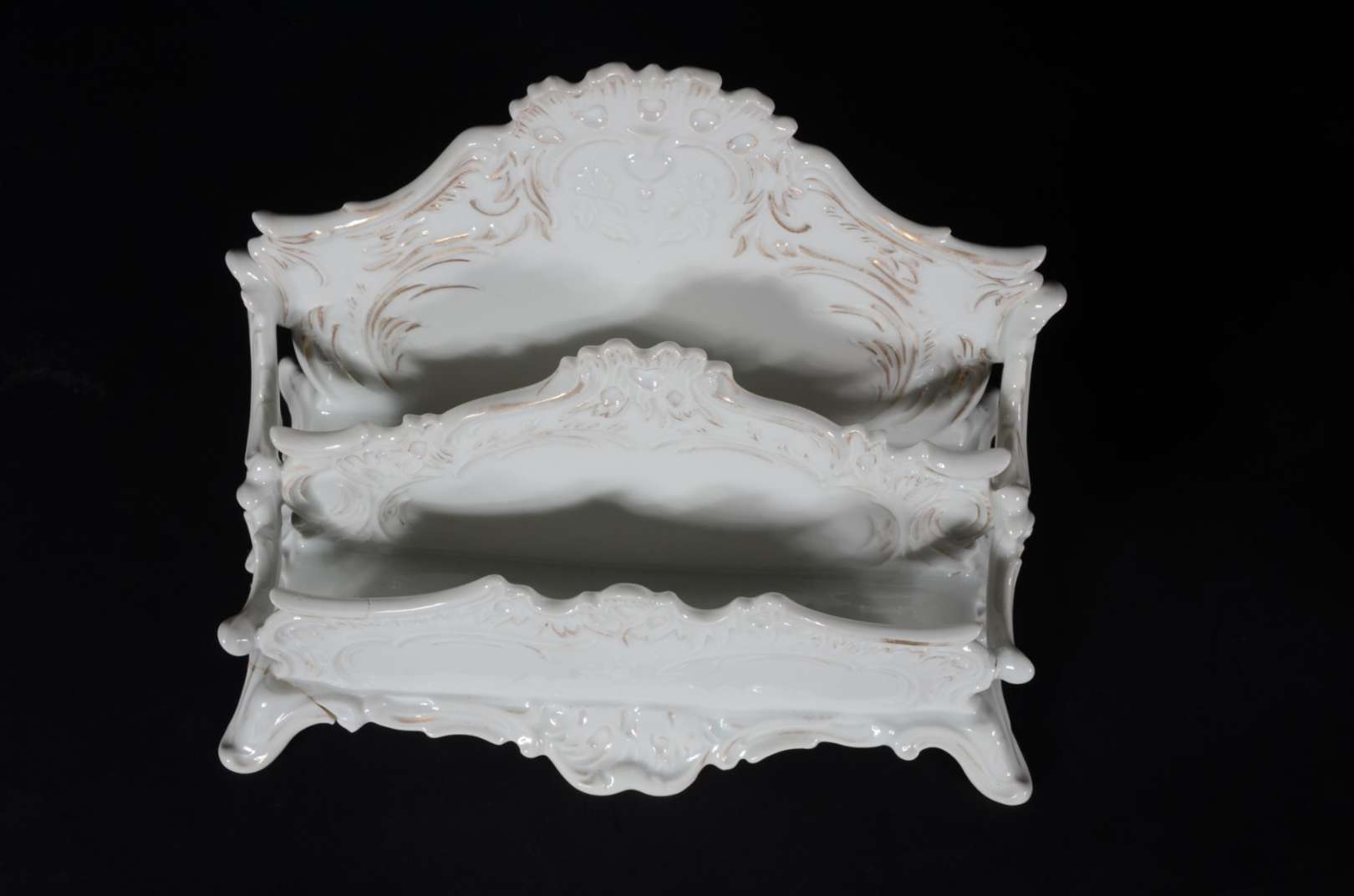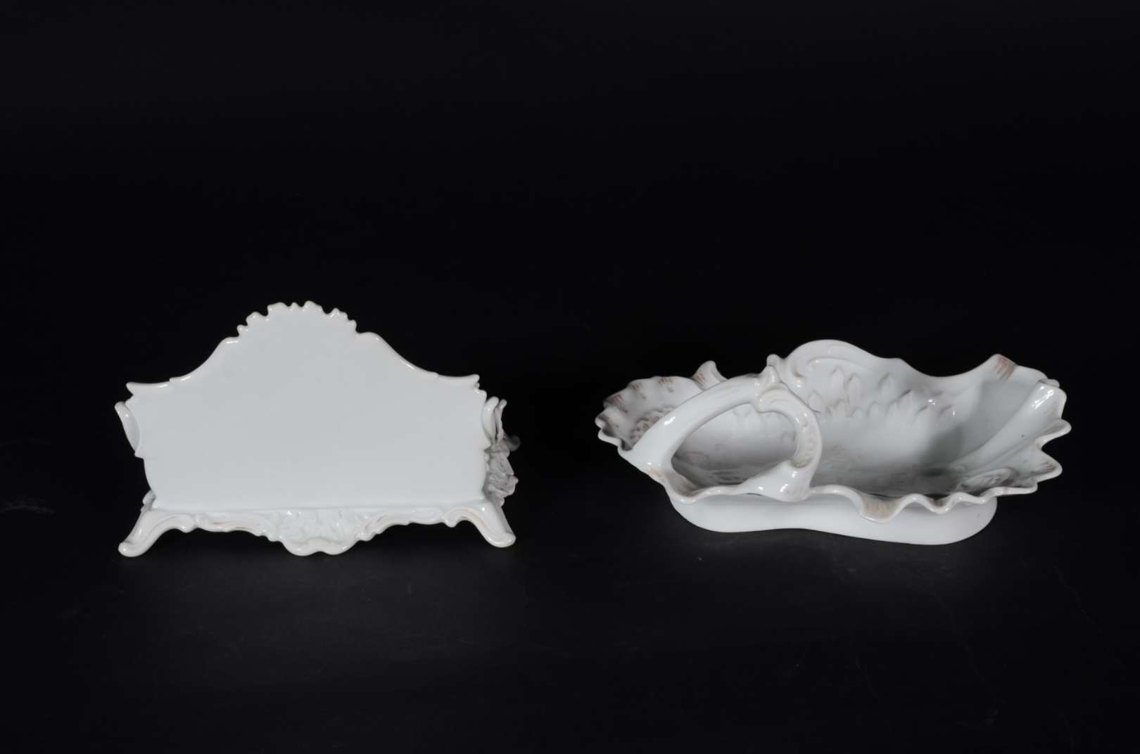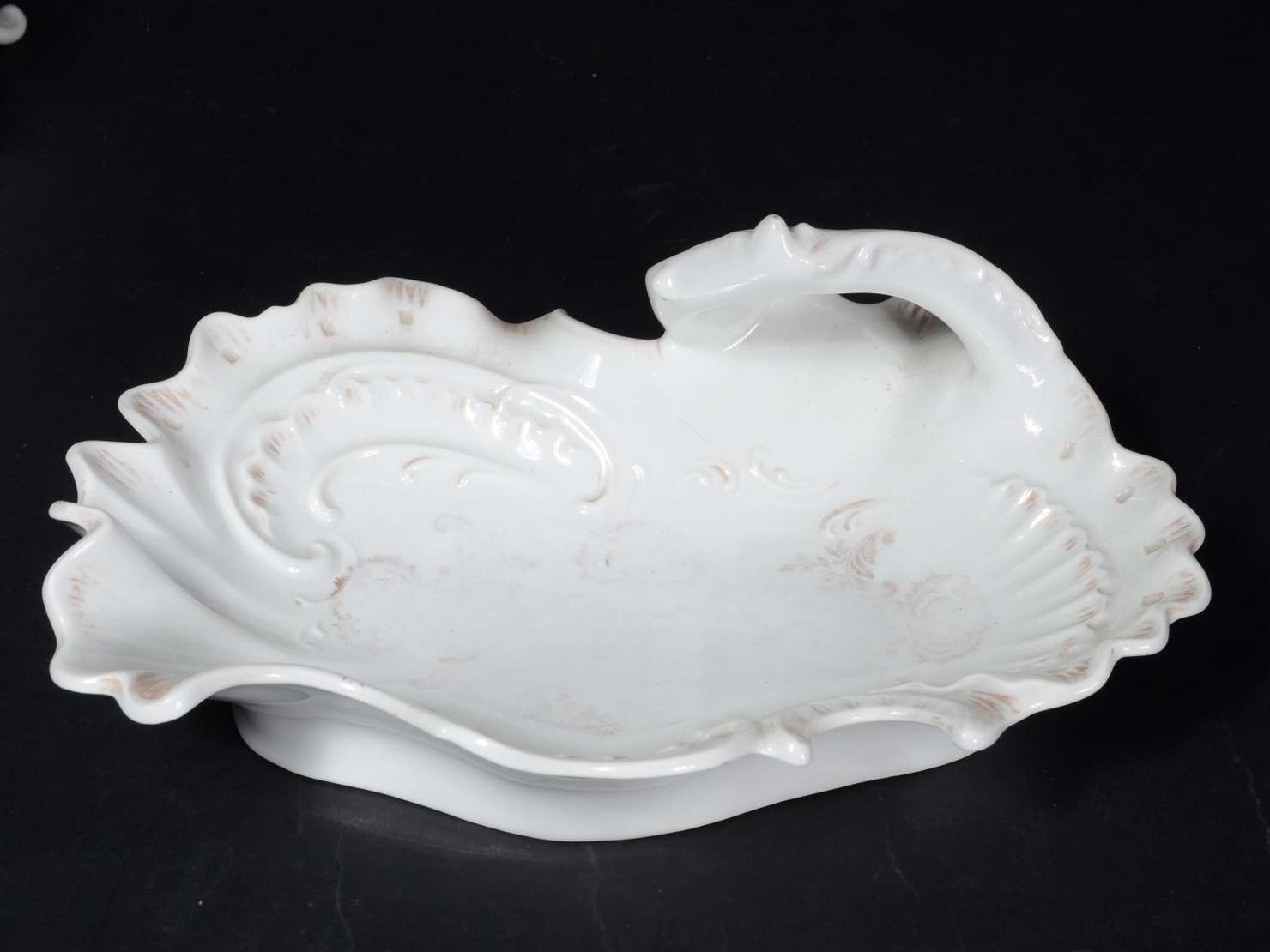 Conjunto com fruteira e par de enfeites de cerâmica branca com frutos em relevo. Uma delas com restauro.