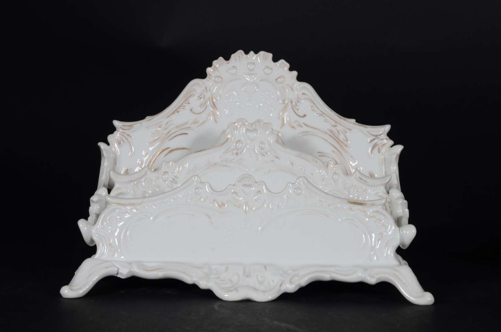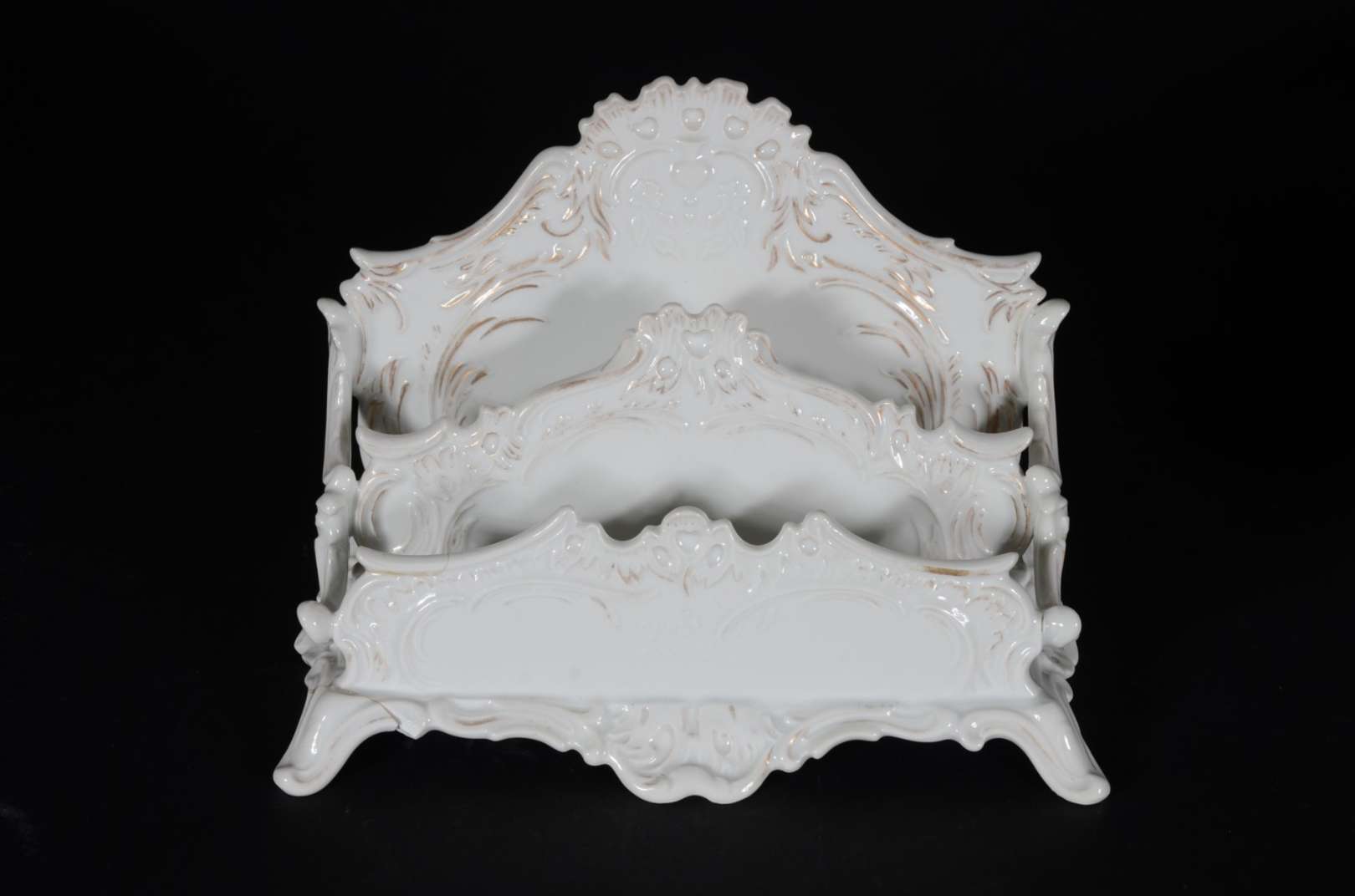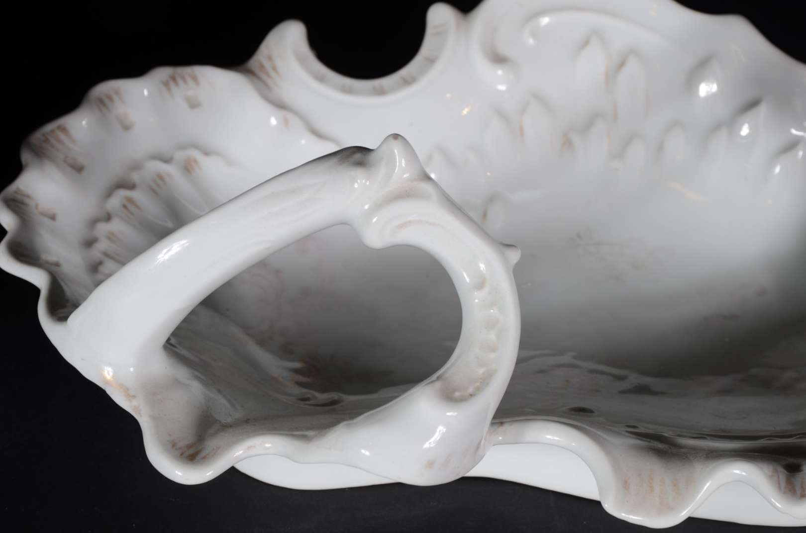 Conjunto com fruteira e par de enfeites de cerâmica branca com frutos em relevo. Uma delas com restauro.