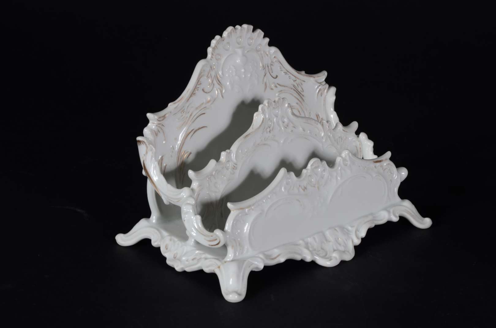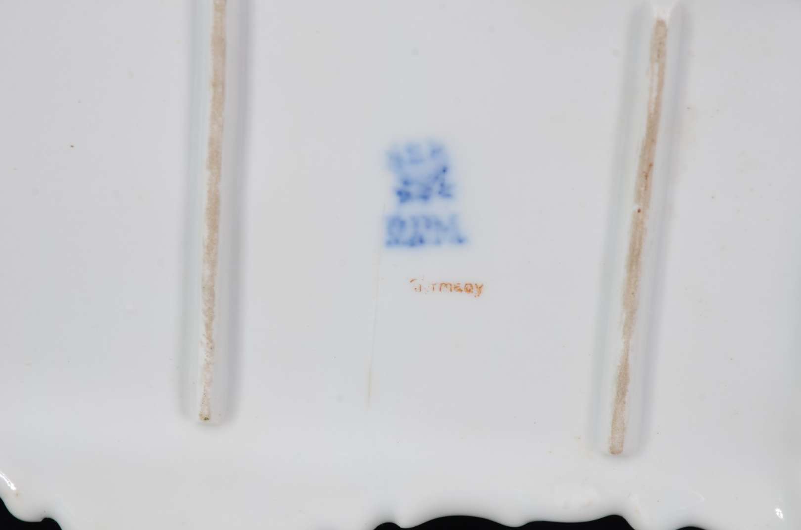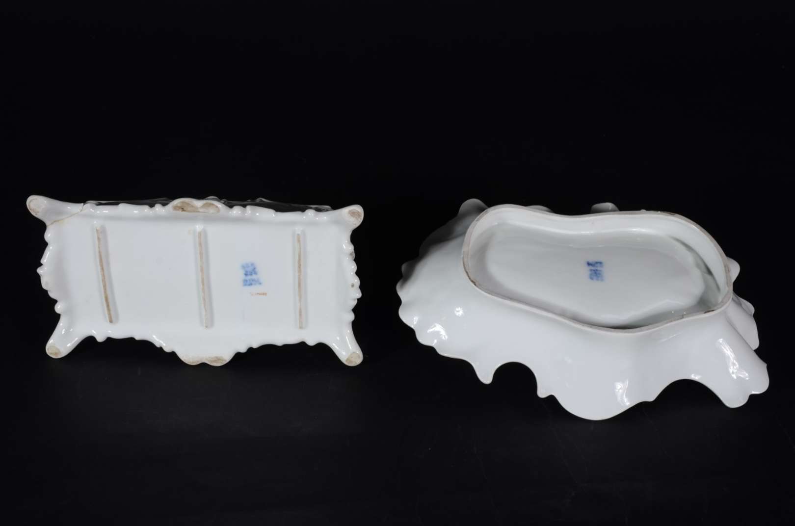 Pequena fruteira de porcelana europeia com flores em relevo policromado e realces dourados, galeria vazada. Restauro.
