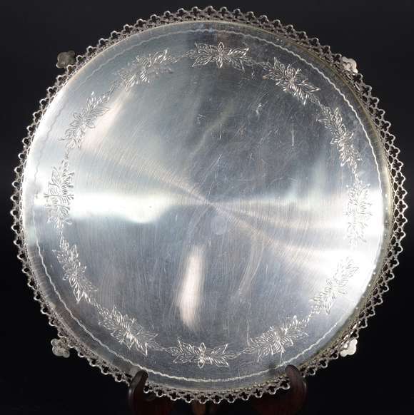 Salva de prata contraste 833 mls, prateiro Correa, fundo cinzelado com galeria vazada. Peso da prata: 1760 g. (Por m...