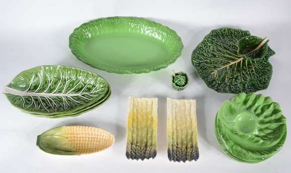 Quatorze peças diversas de cerâmica verde e amarela, sendo 3 travessas na forma de folhas, 1 porta milha, 2 porta as...