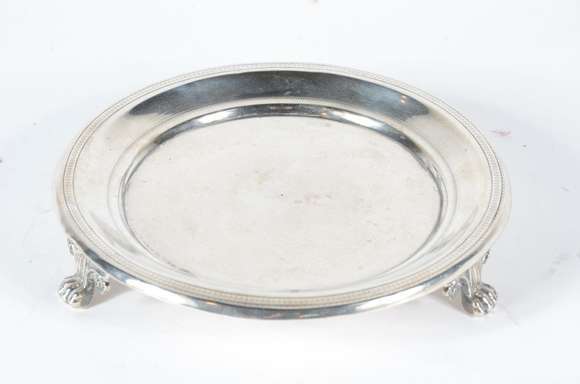 Salva de prata Dona Maria, contrastada, pés de garra. Pequenos amassados. Peso da prata: 210 g.(Por motivos de segura...