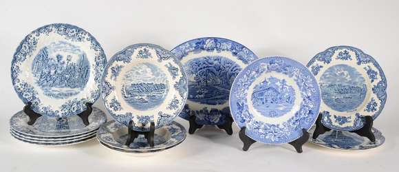 Diversas pratos de faiança inglesa azul e branca, várias decorações. Total: 11 peças.