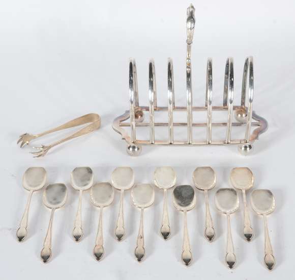 Diversas peças de metal prateado ingles Mappin & Webb, sendo: 12 colherinhas para sorvete; pinça para açúcar e, porta...
