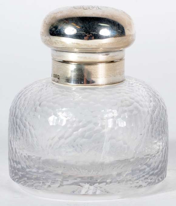 Tinteiro de cristal com tampa de prata de lei e monograma.