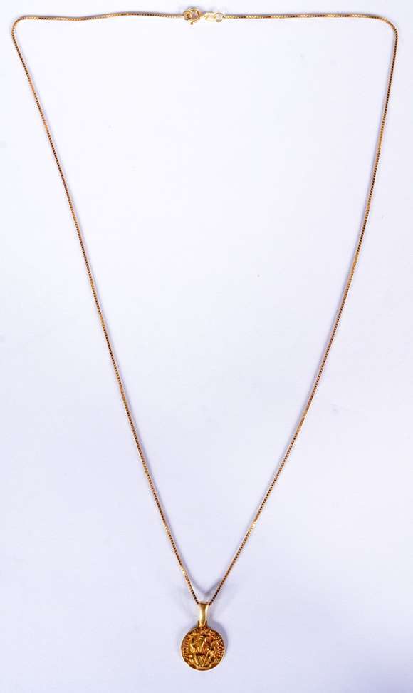 Colar de ouro 18 k., contraste 750 mls com pendente sacro. (Por motivos de segurança a peça não se encontra na loja).