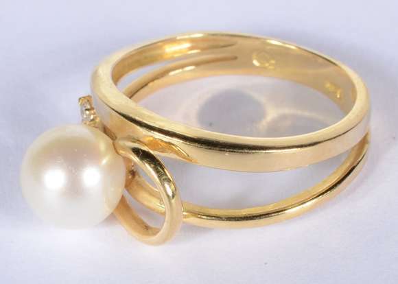 Anel de ouro 18 k., contraste 750 mls com perola e um brilhante, aro 16. (Por motivos de segurança a peça não se enco...