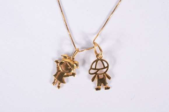 Colar com dois pendentes representando menino e menina de ouro 18 k., contraste 750 mls, estilo veneziano. (Por motiv...